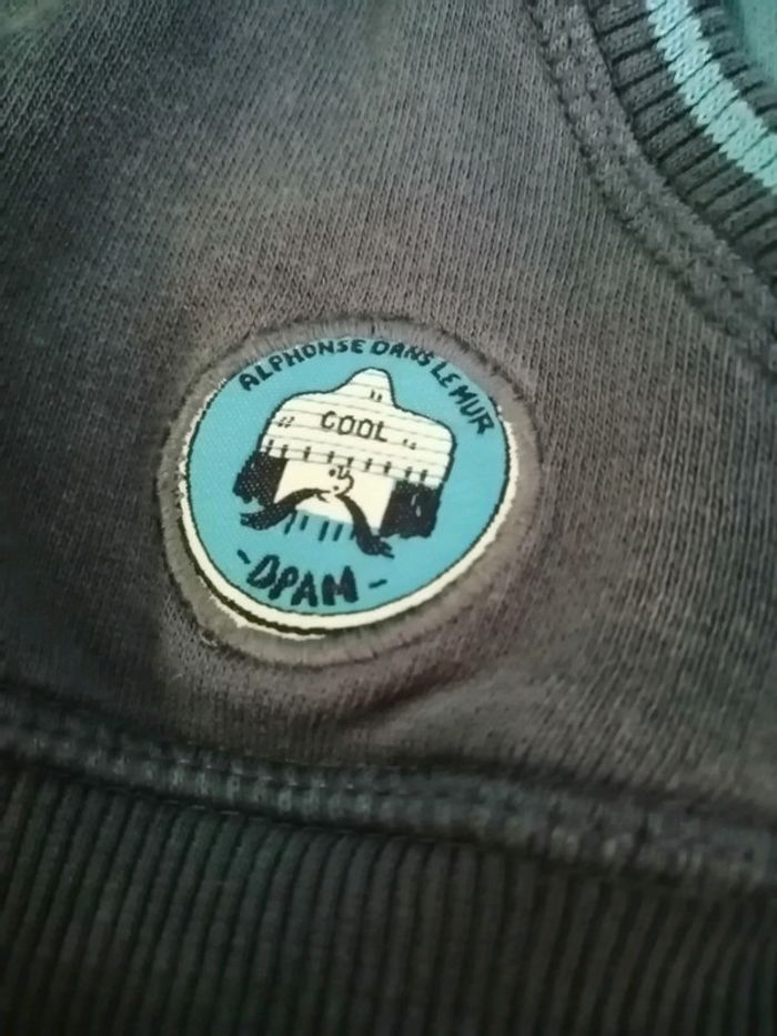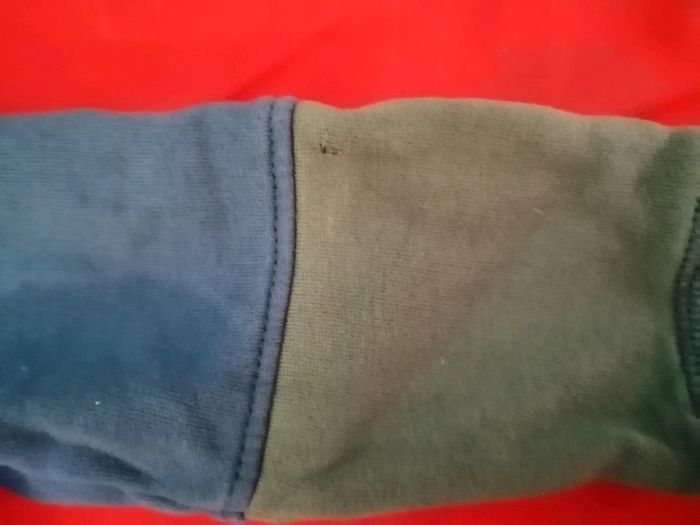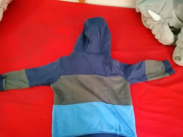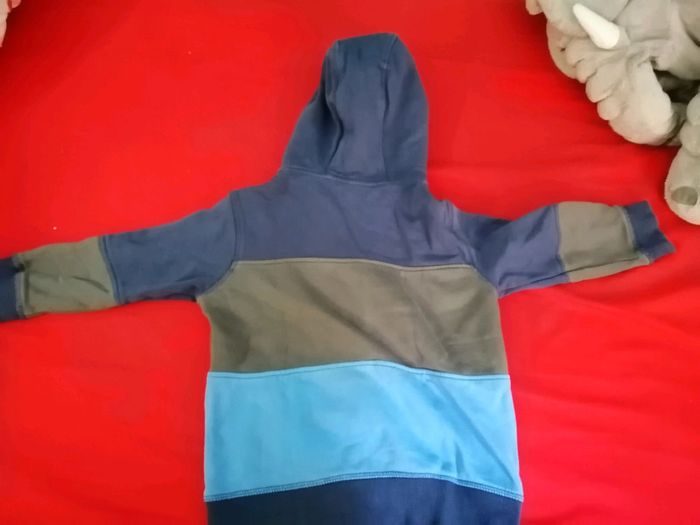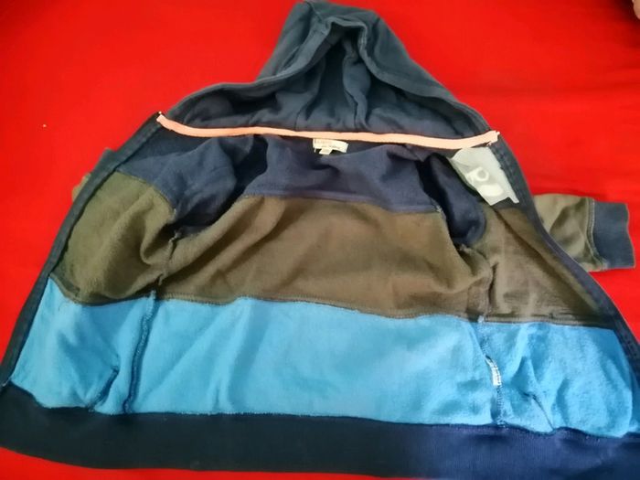 Gilet "du pareil au même" 5 ans. Très peu porté mais à un mini accroc sur une manche. Teintes bleu et kaki. A capuche. Fermeture zip, état nikel.