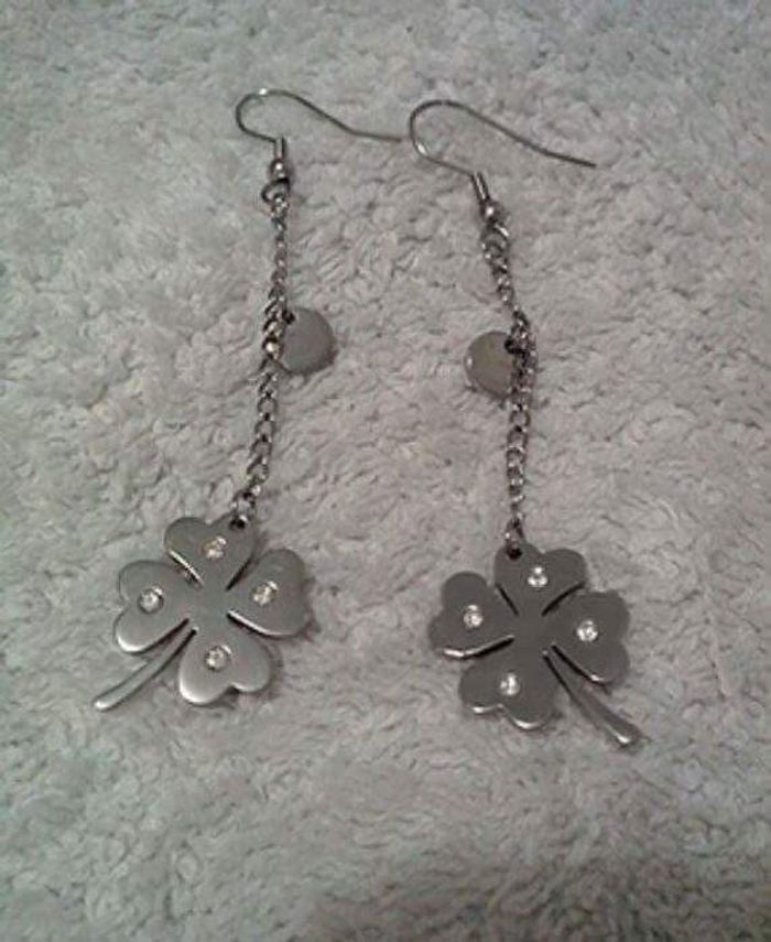 Pendantes. En acier. Avec petits brillants sur les trèfles. #bouclespendantes #acier #chance #trefle