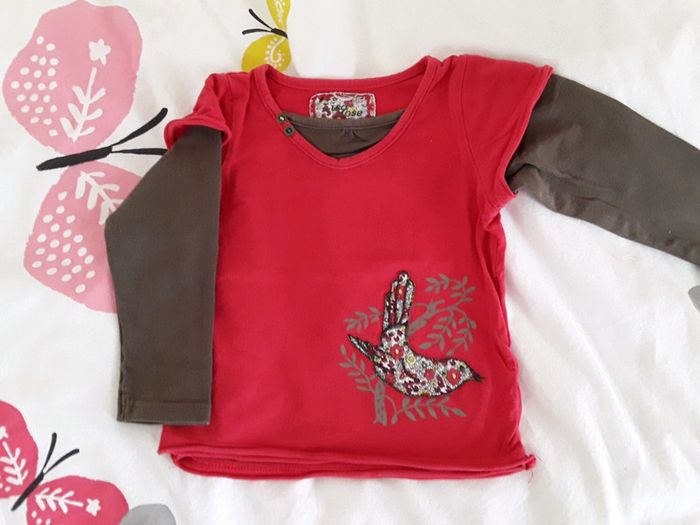 Ensemble composé d'un pantalon marron et d'un t-shirt rouge à motif oiseau