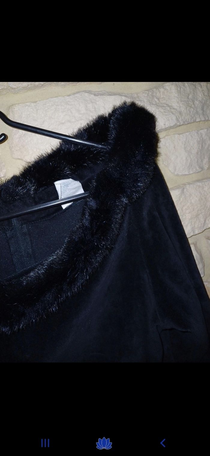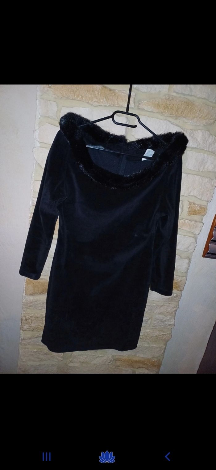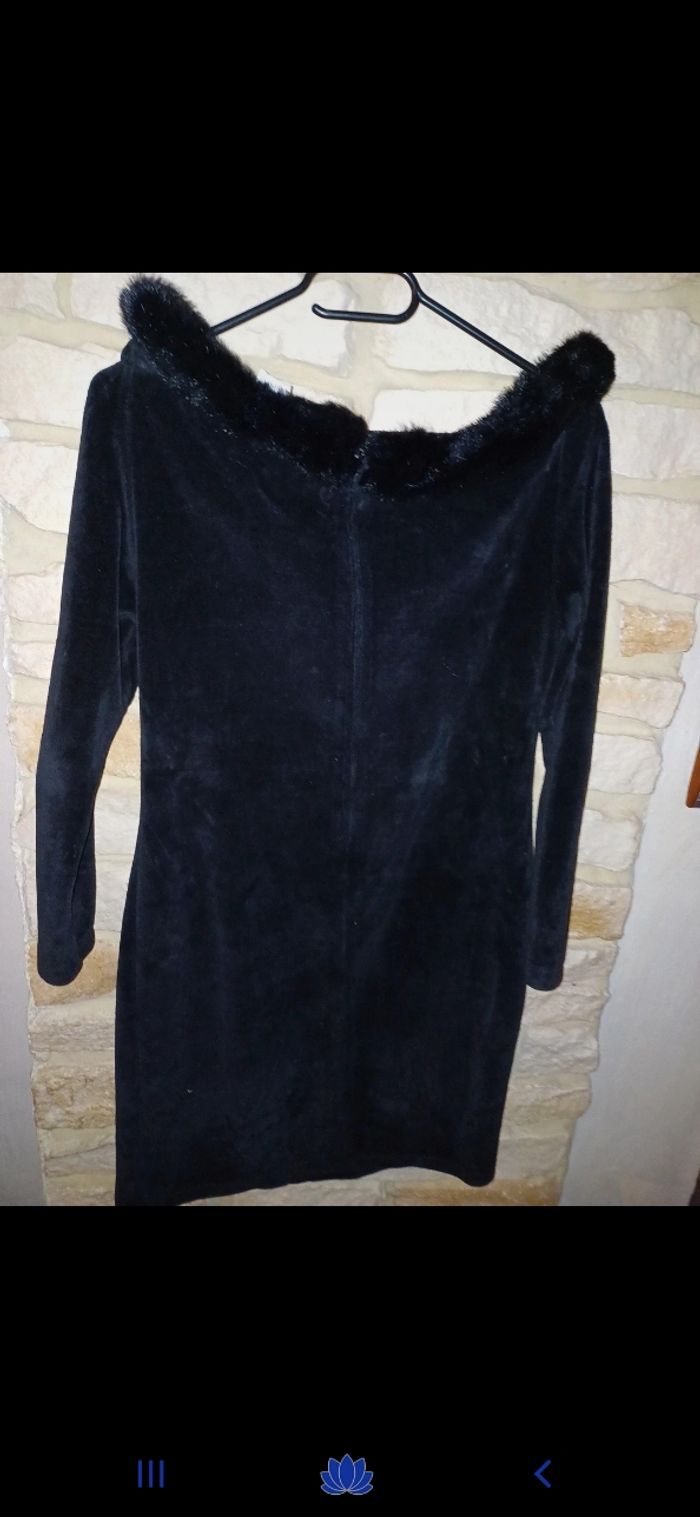 Jolie robe en velours avec fausse fourrure à l encolure. Fermeture éclair à l arrière. En très bon état. Manches 3/4