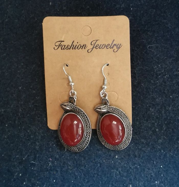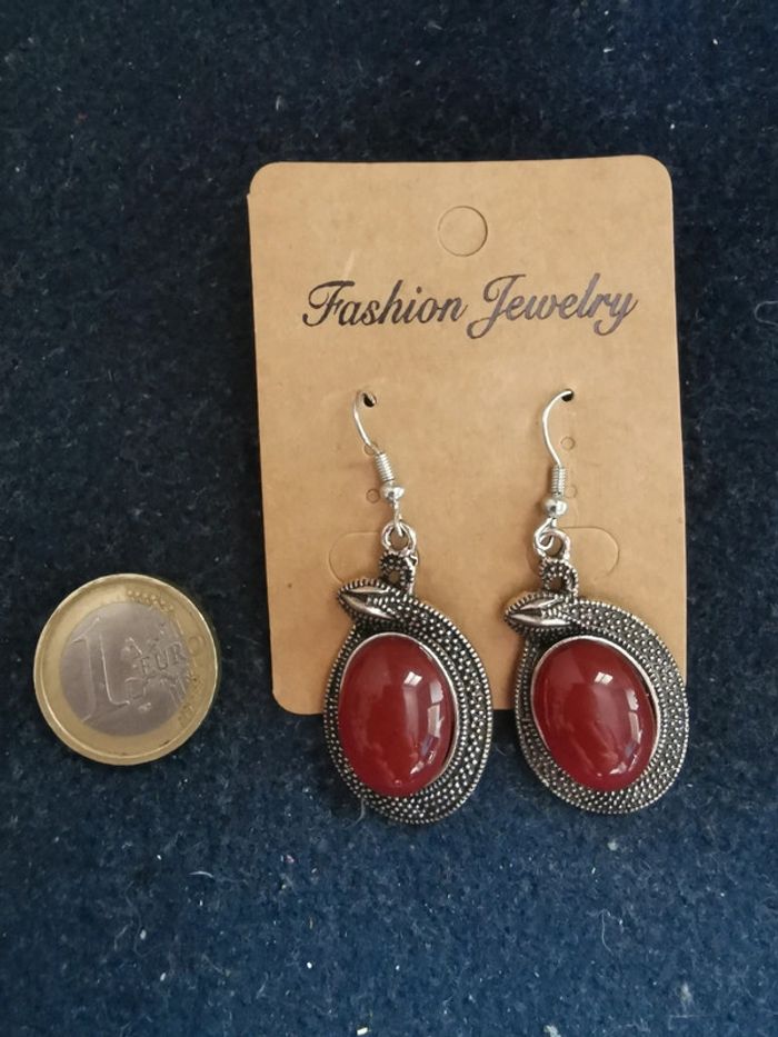 Jolies boucles d'oreilles fantaisie argentées et rouges, avec un serpent sur chaque boucle. Pour 1€ de plus je peux rajouter une pochette pochette à maquillage rouge avec un petit miroir, si cela vous intéresse envoyez moi un message. Remise sur les lots profitez en, j'ai énormément de paires dans mon dressing #morganelcfbijoux
