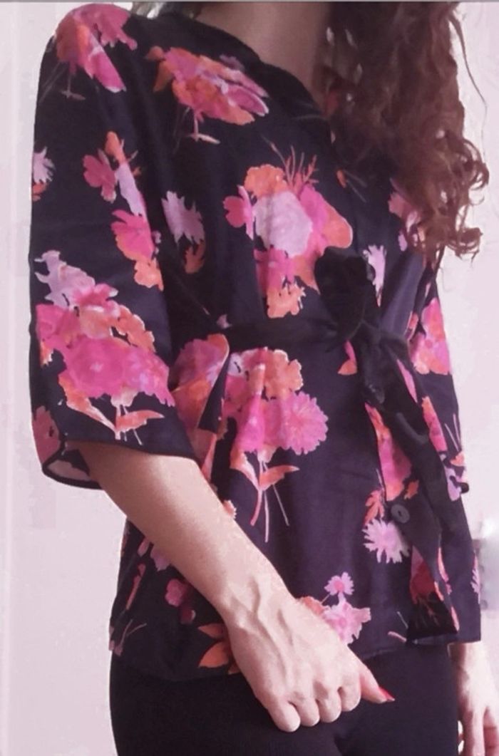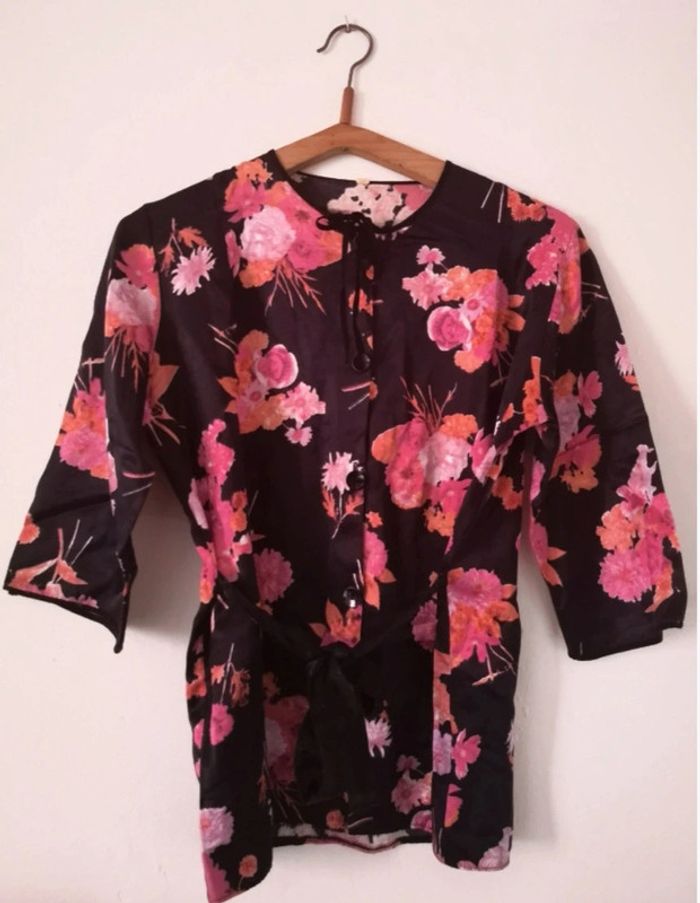 Plus d'étiquette mais probablement du synthétique. Vintage, Années 80. Parfait état. Indiquée comme un 44 mais les tailles étant différentes à l'époque je pencherais plus pour un M. Pour indication je fais moi même un S et elle est légèrement Oversize sur moi (photo). Mesures : largeur d'épaules 39 cm, longueur des manches 38 cm, longueur totale 61 cm.