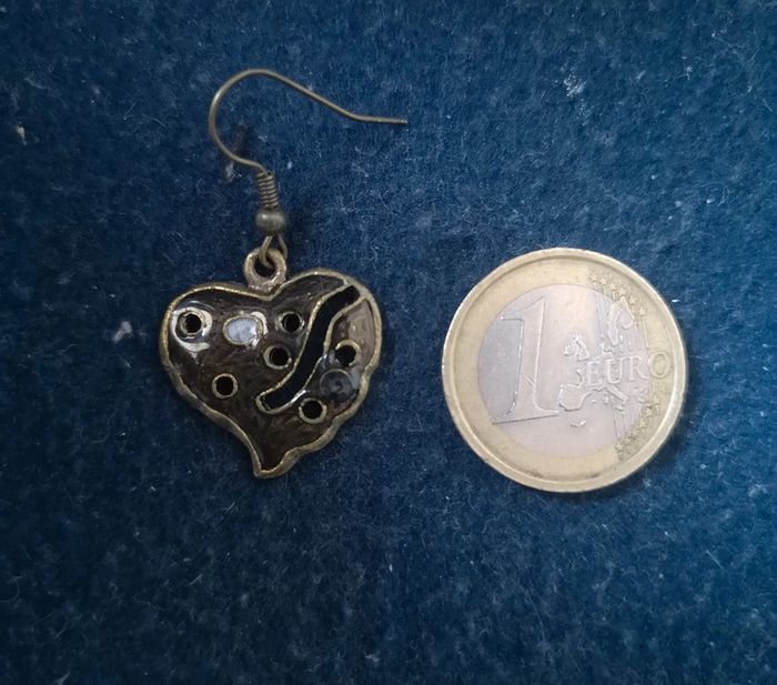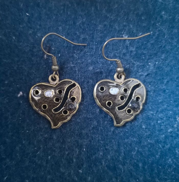 Boucles d'oreilles vintage en forme de cœur marron avec un strass argenté. Années 80. Pour 1€ de plus je peux rajouter une pochette à maquillage rouge avec un petit miroir, si cela vous intéresse envoyez moi un message. Remise sur les lots profitez en, j'ai énormément de paires dans mon dressing #morganelcfbijoux