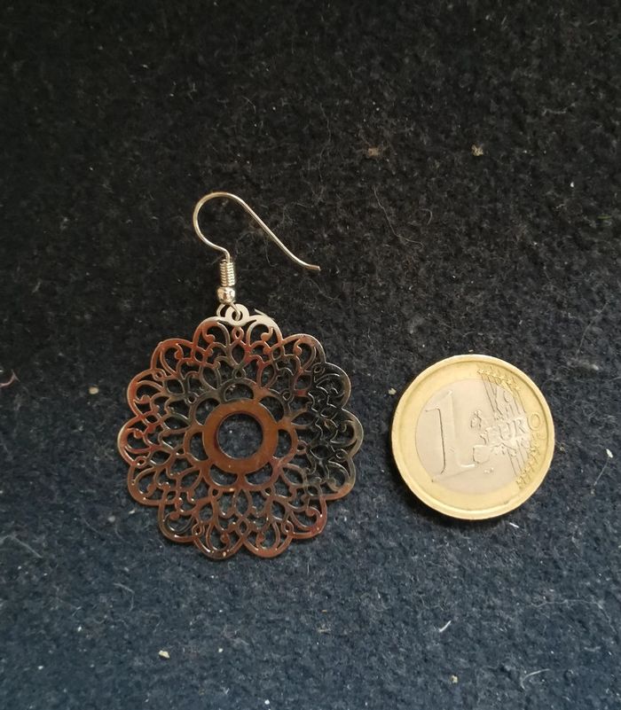 Jolies boucles d'oreille fantaisie en forme de fleurs argentées. Pour 1€ de plus je peux rajouter une pochette à maquillage rouge avec un petit miroir, si cela vous intéresse envoyez moi un message. Remise sur les lots profitez en, j'ai énormément de paires dans mon dressing #morganelcfbijoux