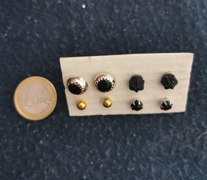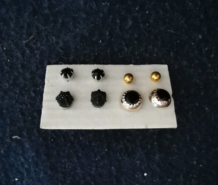 Ensemble de puces d'oreilles, couleurs doré et noir. Pour 1€ de plus je peux rajouter une pochette à maquillage rouge avec un petit miroir, si cela vous intéresse envoyez moi un message. Remise sur les lots profitez en, j'ai énormément de bijoux dans mon dressing #morganelcfbijoux