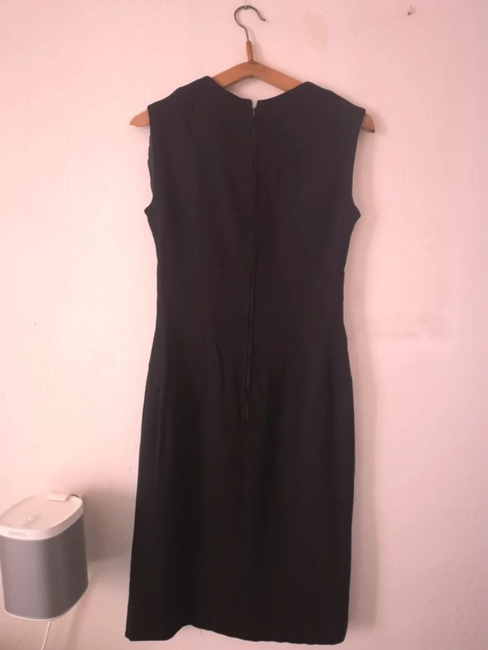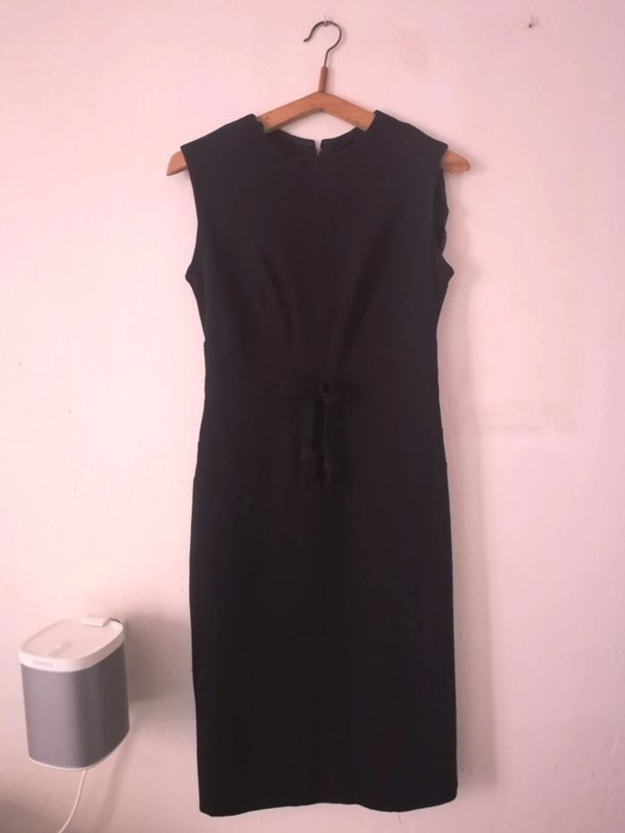 Cintrée avec noeud à la taille 93 cm de longueur, tour de taille 70 cm, tour de poitrine 80 cm épaules 36 cm. Je fais 1m68 et elle m'arrive au dessus du genou. Fermeture éclair dans le dos Elle est doublée mais attention doublure un peu abîmée par endroit