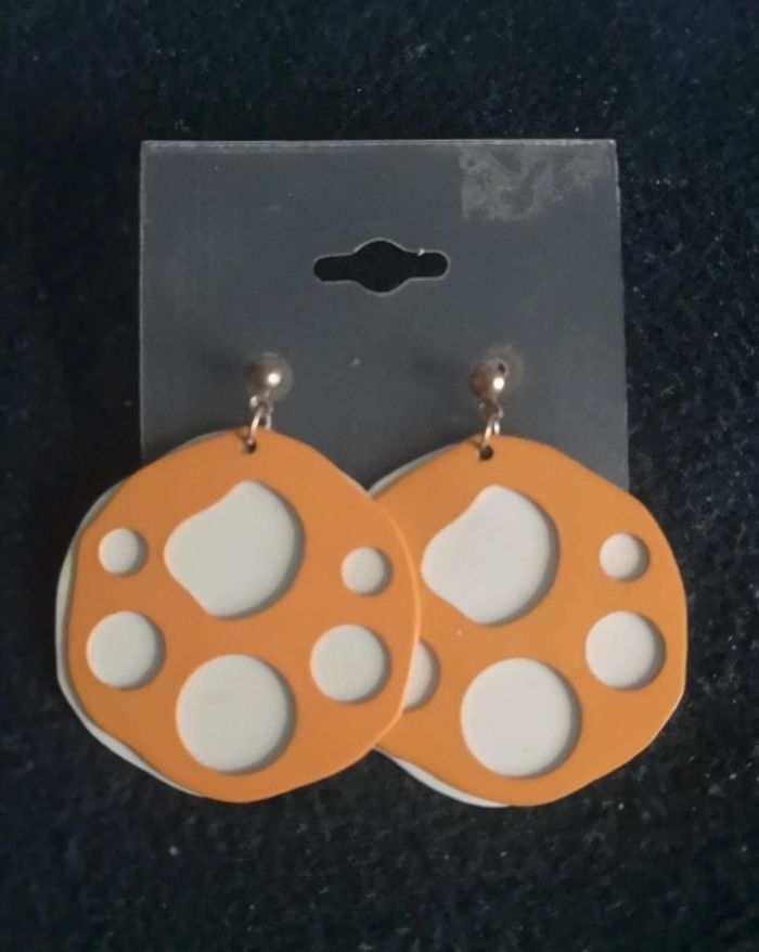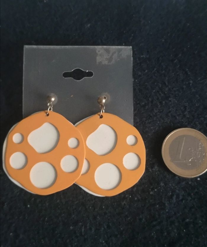 Jolies boucles rondes fantaisies, oranges et blanches. Années 80/90. Pour 1€ de plus je peux rajouter une pochette à maquillage rouge avec un petit miroir, si cela vous intéresse envoyez moi un message. Remise sur les lots profitez en, j'ai énormément de bijoux dans mon dressing #morganelcfbijoux