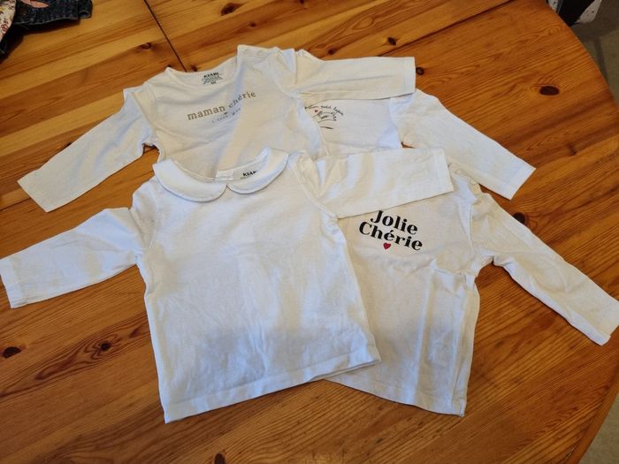 Lot de 4 t-shirt à manches longues "Maman chérie" neuf "Jolie chérie" neuf Les 2 autres sont portés quelques fois sous des robes Bas gauche -> col Claudine