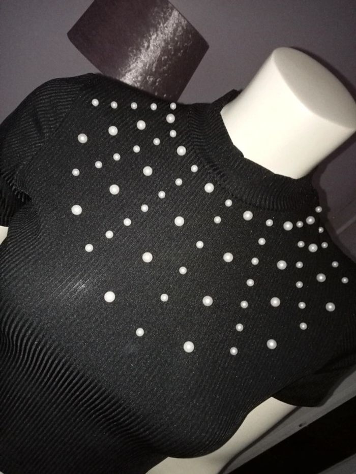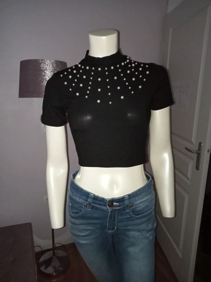 Crop top côtelé col montant en lycra noir a perles neuf by Jennyfer taille S - photo numéro 1