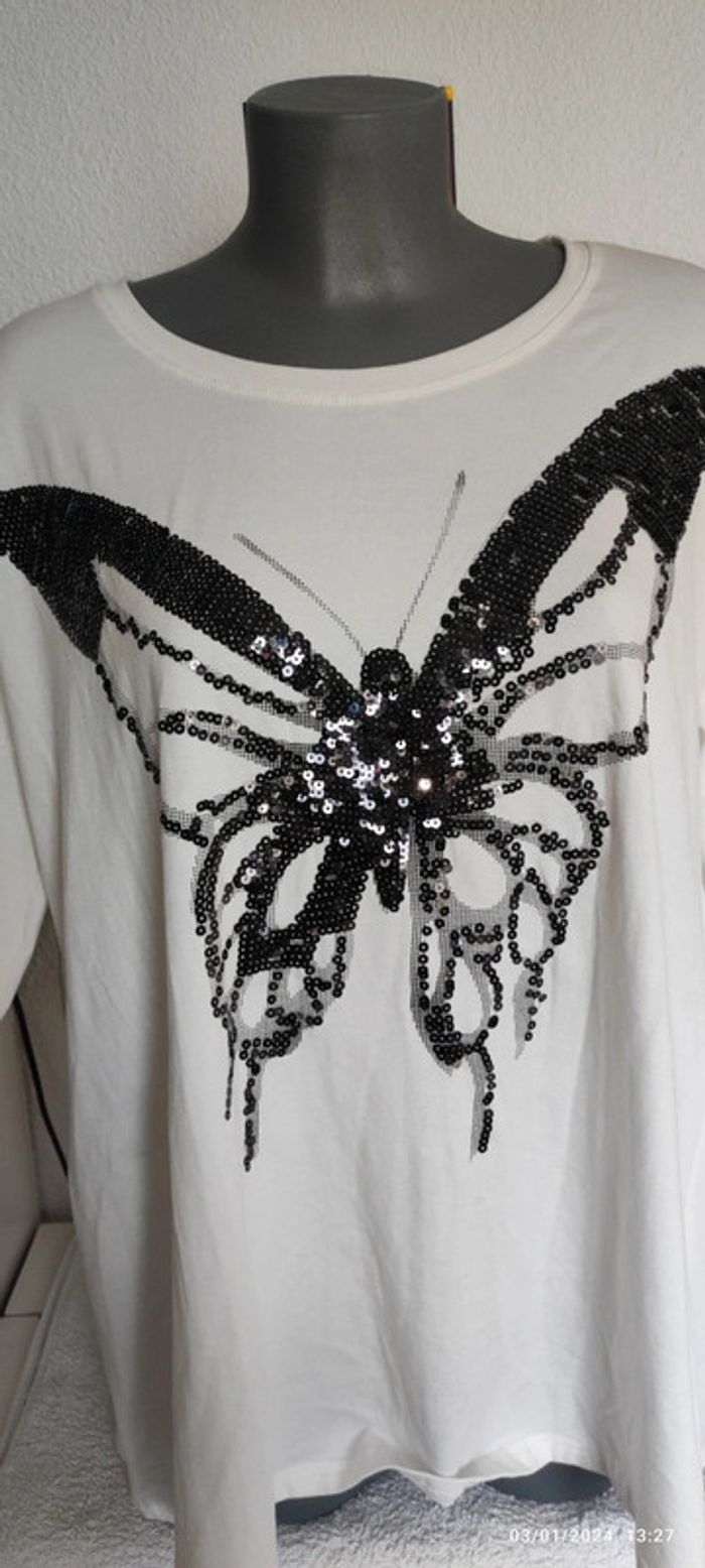 Magnifique haut manche longue super qualité et matière douce très agréable papillon déco strass brillant taille 54 neuf avec étiquette
