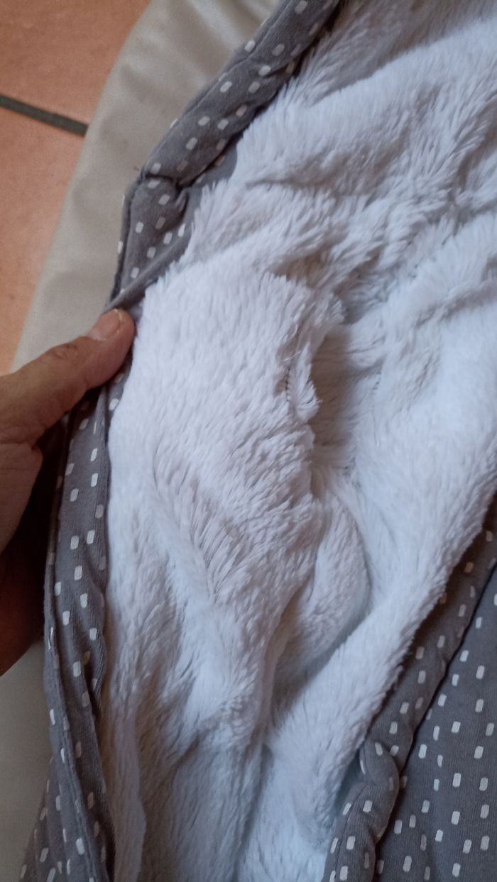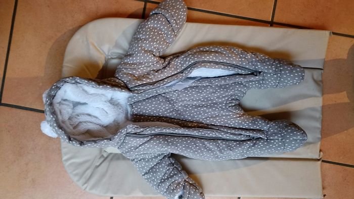 Combi pilote très chaude ( fourrée) taille un mois, très peu portée car j'habite dans le sud.. au bas des manches ya des moufles intégrées avec fente pour sortir ou non la main du bébé.