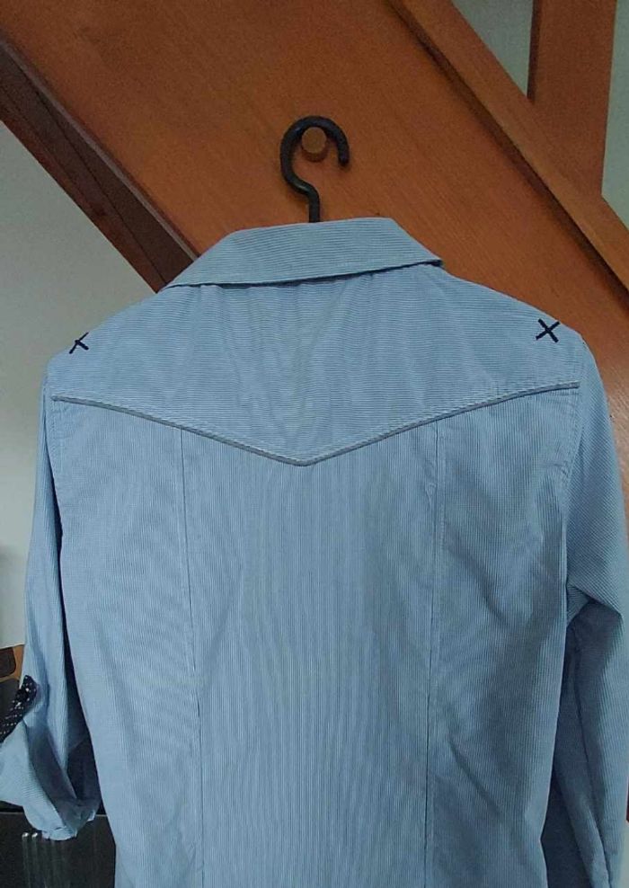 FEMME 38 / M N°1452 Chemise vichy Bleu / blanc Possibilité manches retroussée 71% coton 26% polyester 3% elasthane Taille 38 / m Cache cache 6,50€ #kelly_femmeT38