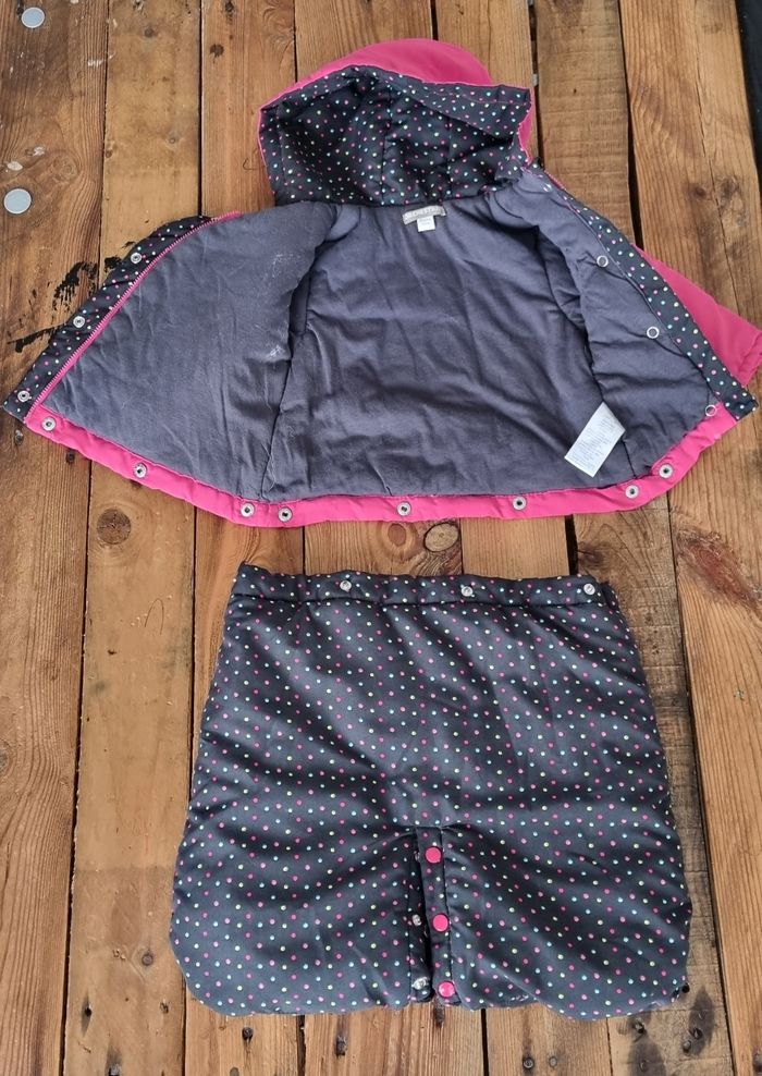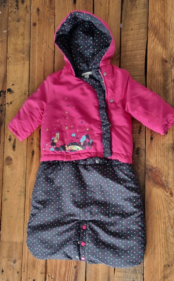 - manteau amovible - ouverture entrejambe pour change - taille un peu grand mais permet de mettre de bonne couche de vêtements sans que bébé soit serré.