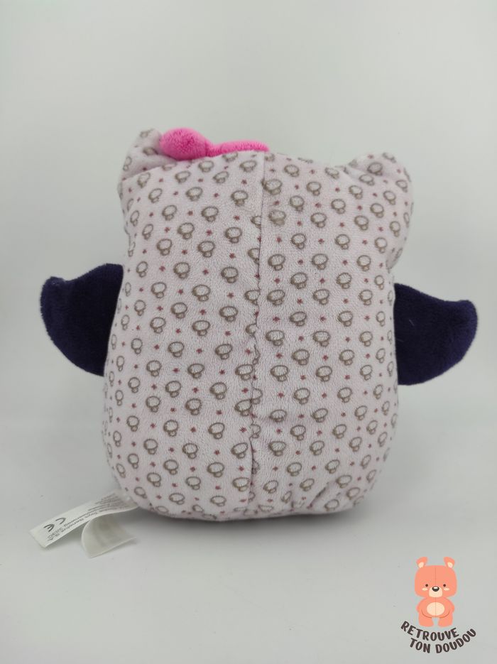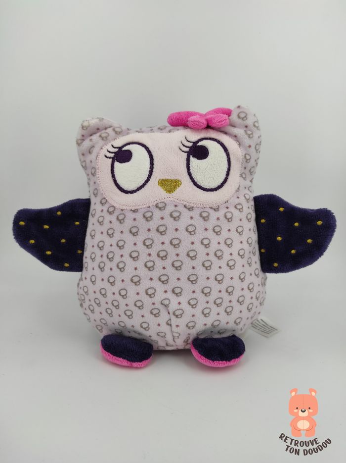 🦉 Peluche Doudou Chouette mauve et bleu nuit avec motifs champignon et noeud rose sur la tête, Simba Toy 📏 Dimension : 18 cm environ ✨ Occasion, comme neuf 💦 Lessivé avec lessivé hypoallergénique 🧼 👀 Vous achetez le doudou que vous voyez sur les photos.
