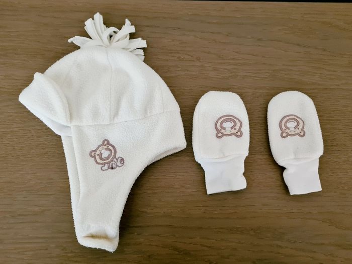 Bonnet blanc et moufles avec motif ourson taille 45