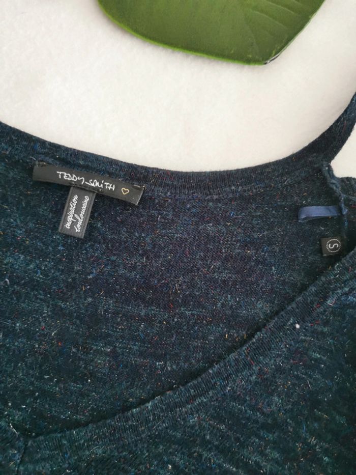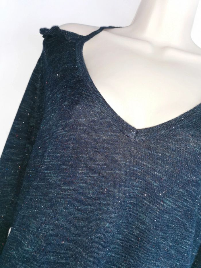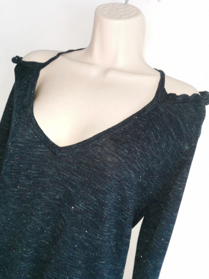 Top épaules dénudées 👩 Teddy Smith Taille S • Matière: 50% viscose - 29% coton - 20% polyamide - 1% fibre métallisé • Épaules dénudées • Décolleté en V • Fines bretelles • Manches longues bords côtes • Finition volantée aux épaules • Couleur: Bleu marine 🟦 avec fils 🧵 metalisés pailletés • 📏 Longueur: 78 cm • 📏 Mesure sous aisselles: 48 cm Parfait état👌, très peu porté #SoStyLifemmeTailleS