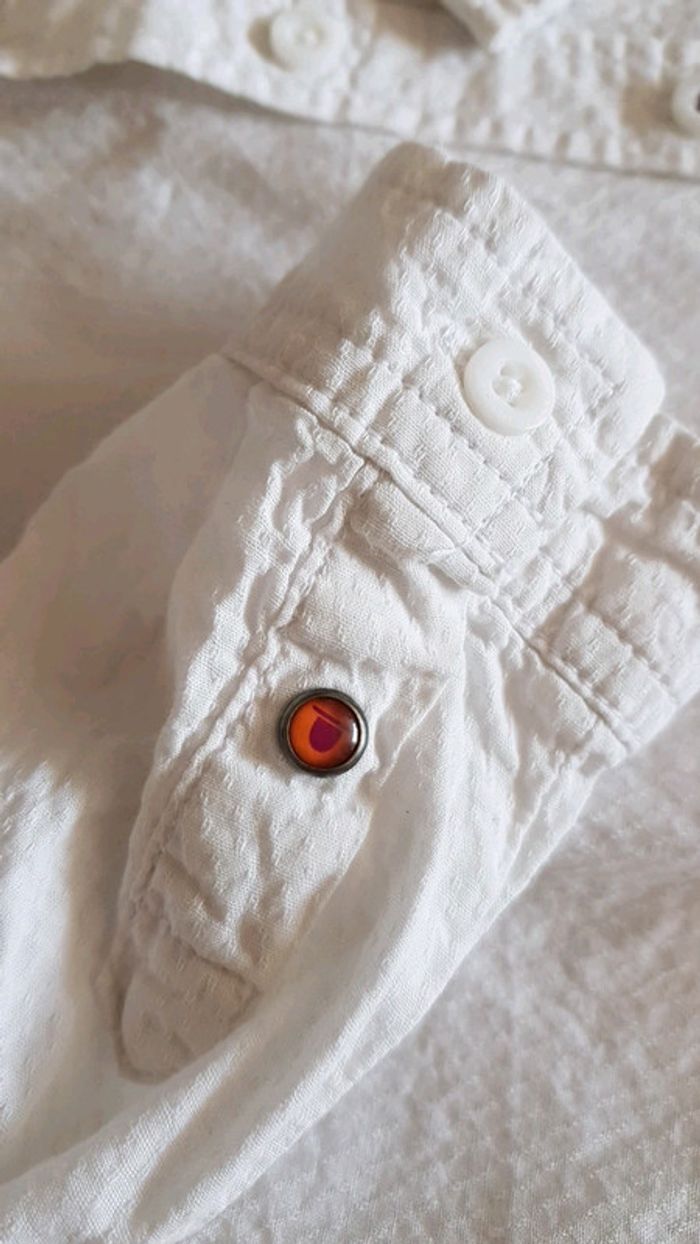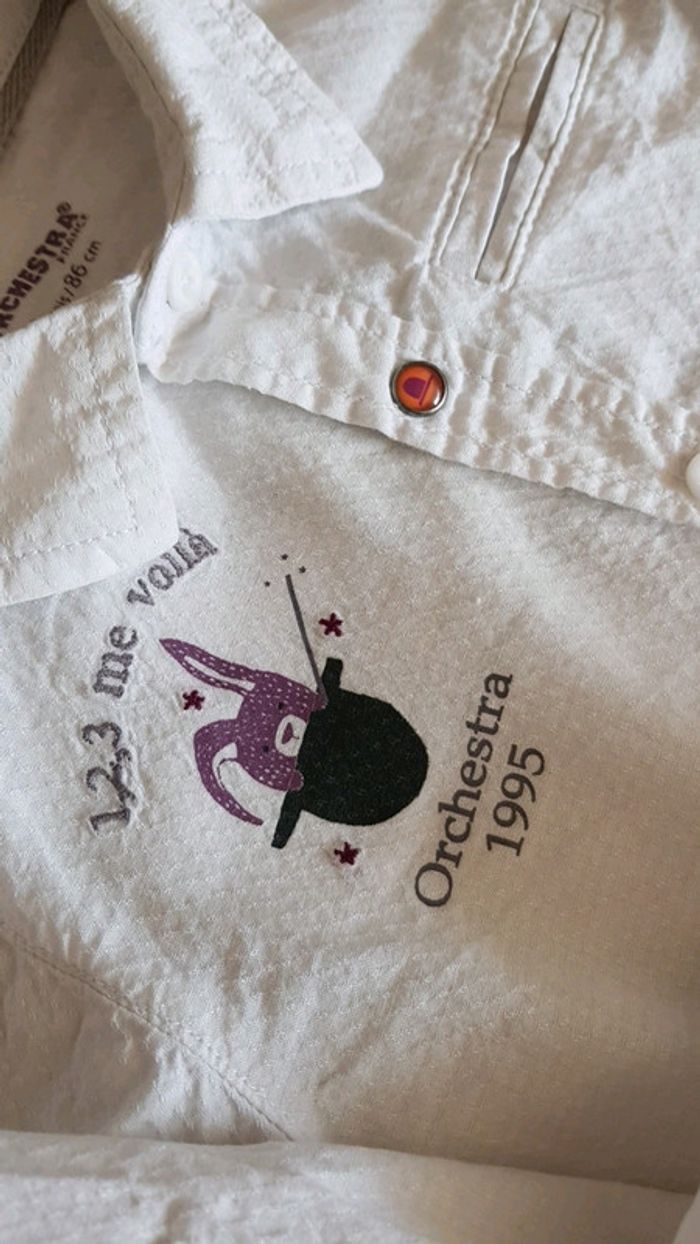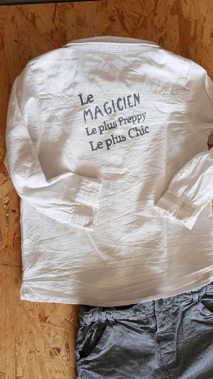 Ensemble simple mais class' Short long à rayures fines. Ajustable à la taille. Chemise manches longue légère . Possibilité de passer en manches courtes (maintien par bouton). Petits motifs reliefs sur toute la chemise (voir dernière photo). Boutons pressions décoratif manchette et 1 devant. Ecriture dans le dos. Petit lapin chapeau devant. Fausse poche poitrine. Orchestra Taille 23 mois #klemlogarcon24mois