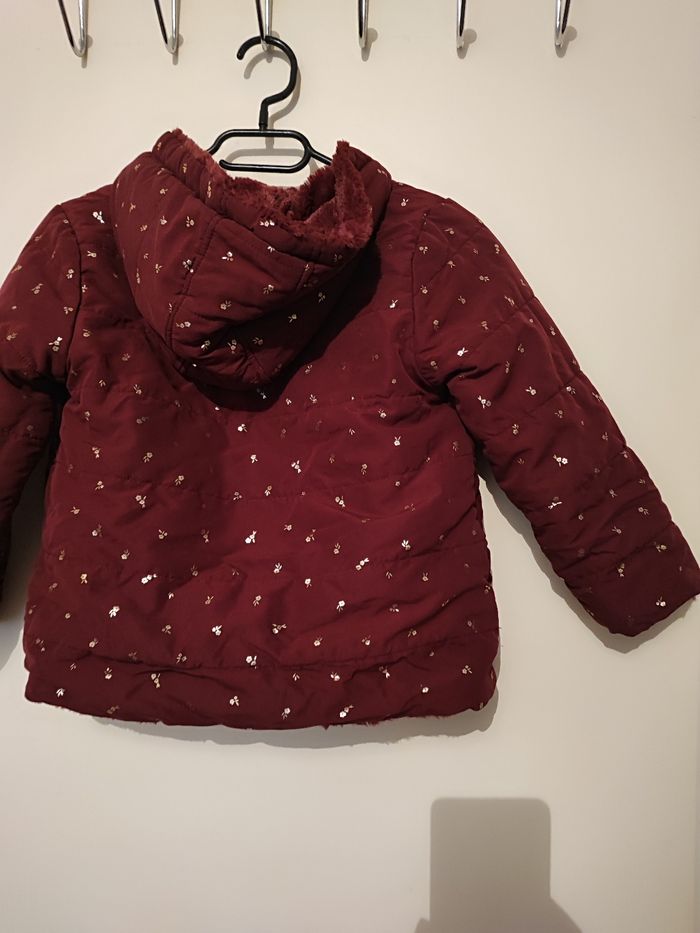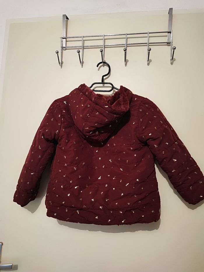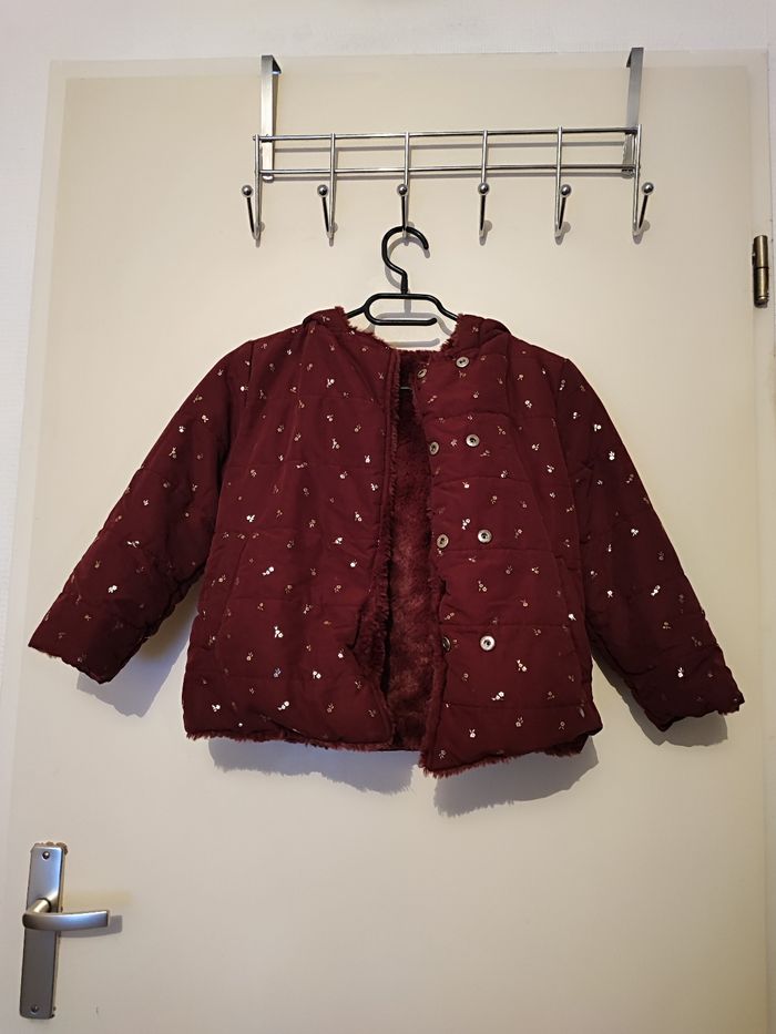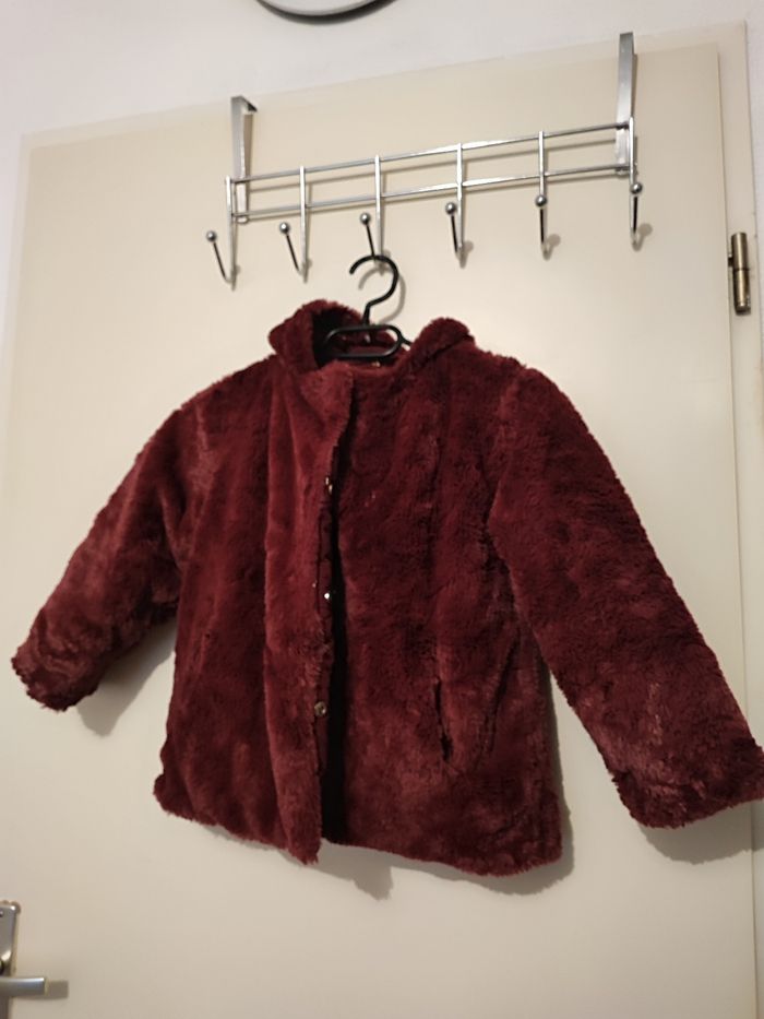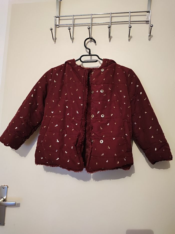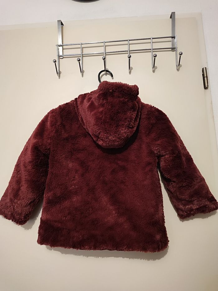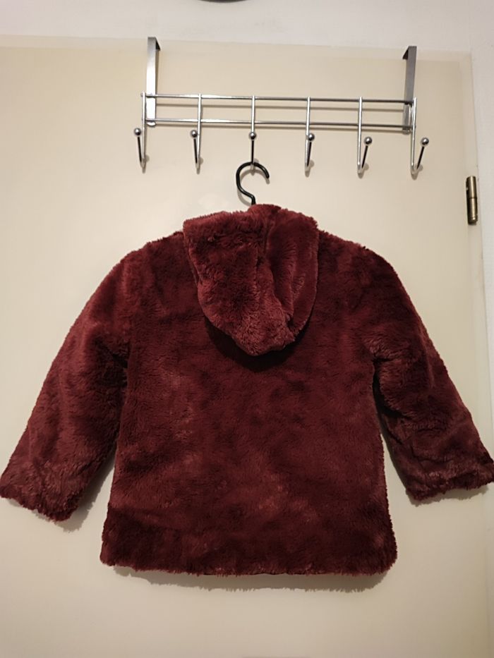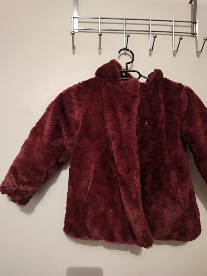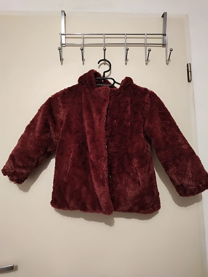 Superbe blouson fille A capuche Réversible Un côté moumoute Un côté matelassé Poches des 2 côté Coloris bordeaux Taille 6 ans Lavé désinfecté Boutons pressions 2 taille d'attache