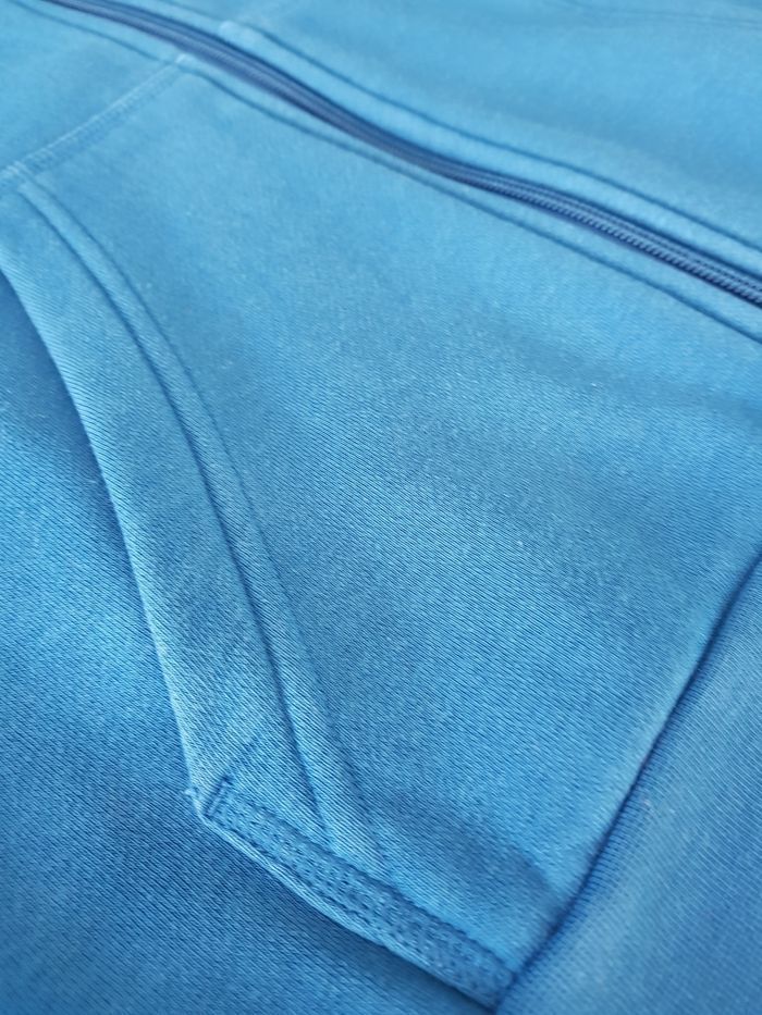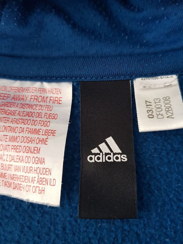 Sweat à capuche zippé bleu pétrole avec le Adidas couleur moutarde. 2 poches. 11 ans mais dans le choix des tailles dans l'annonce il n'y a pas. Donc j'ai mit 10ans.