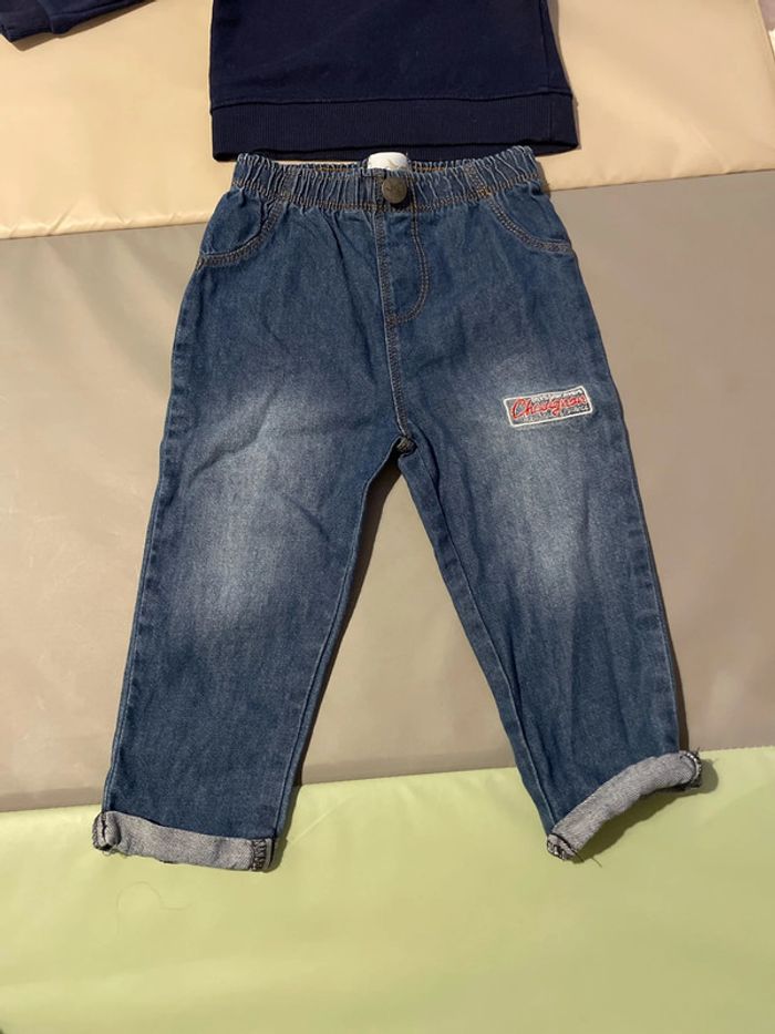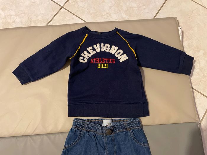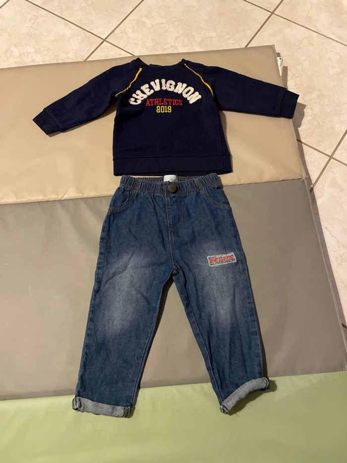 Ensemble 18 mois de marque Chevignon composé d’un pantalon jean élastique et d’un sweat. Excellent état. #dressingdeMilo18moisgarçon