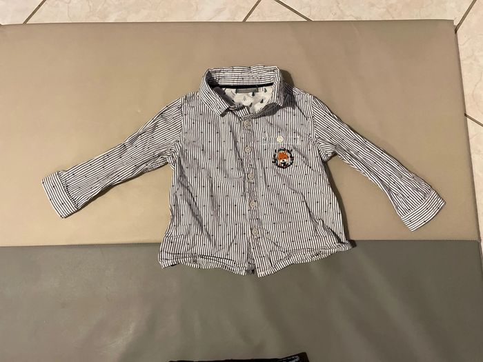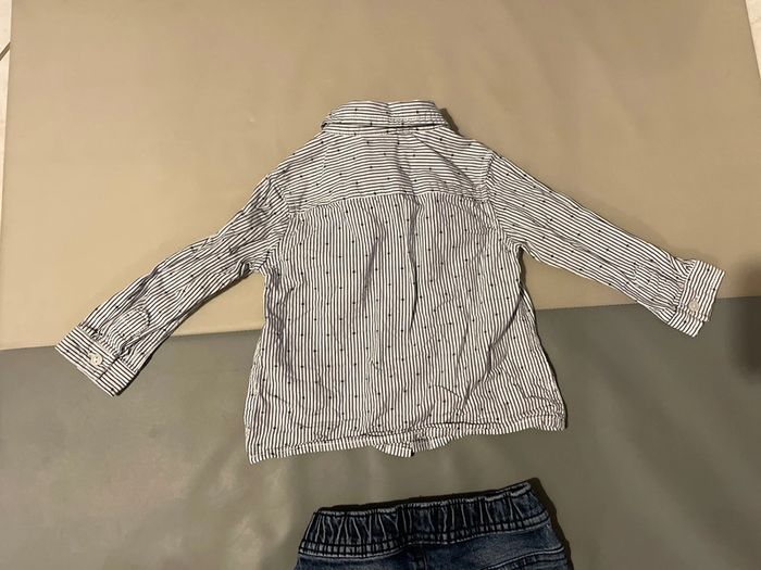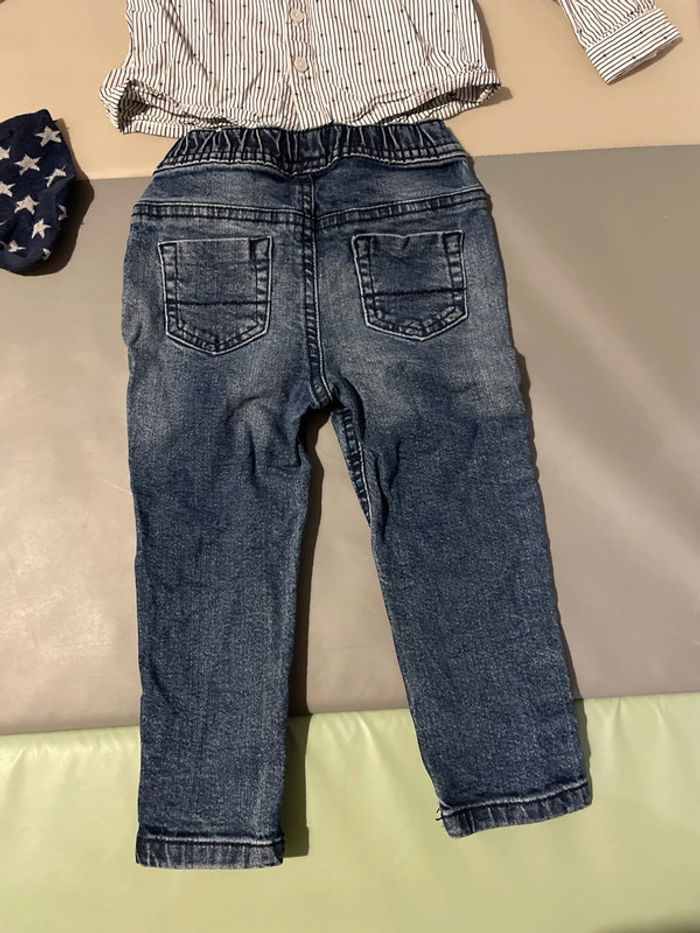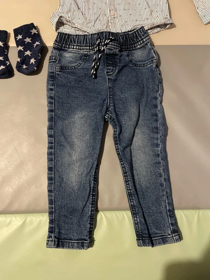 Ensemble habillé 18 mois composé d’un jean élastique et d’une chemise rayée. Une paire de chaussettes est offerte dans le lot. Excellent état #dressingdeMilo18moisgarçon