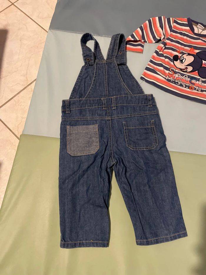 Ensemble Mickey 12 mois composé d’une salopette en jean avec bretelles réglables sur 2 hauteurs et ouverture entre les jambes grâce à des pressions (très pratique pour les changes) et d’un haut à manches longues. Très bon état si ce n’est un petit trou en bas du haut à manches longues (acheté comme ça, sans faire attention 😅), ne se voit pas porté mais je préfère le préciser quand même. #dressingdeMilo12moisgarçon