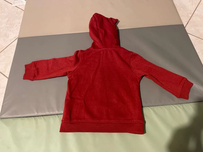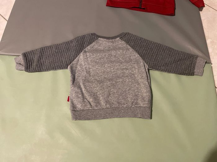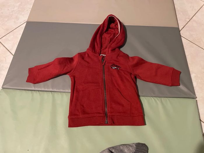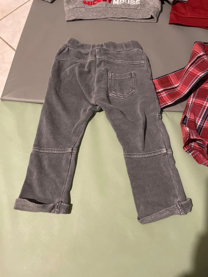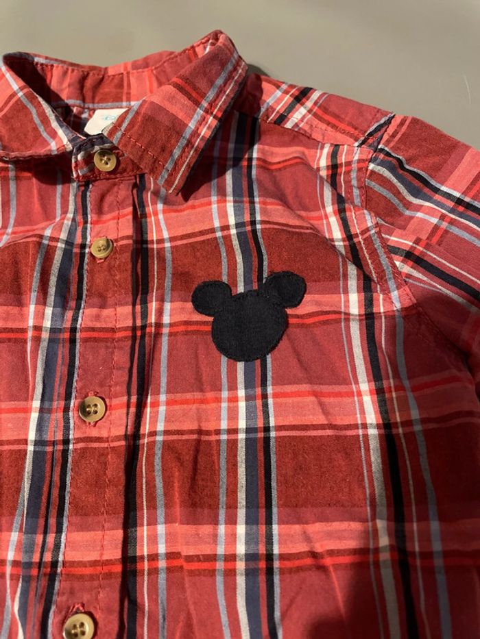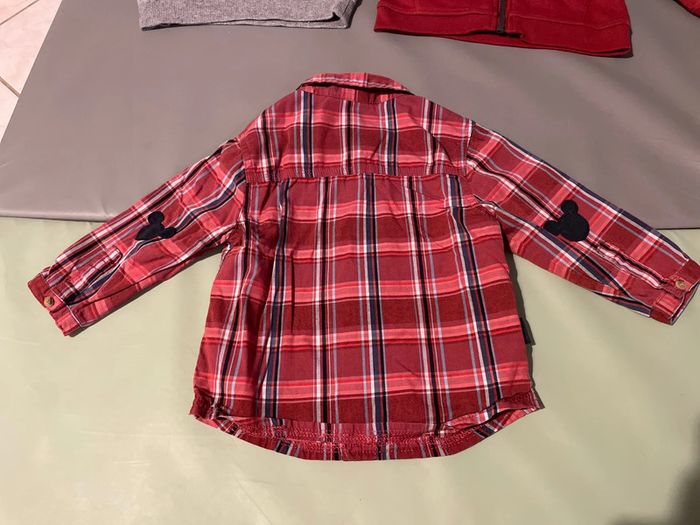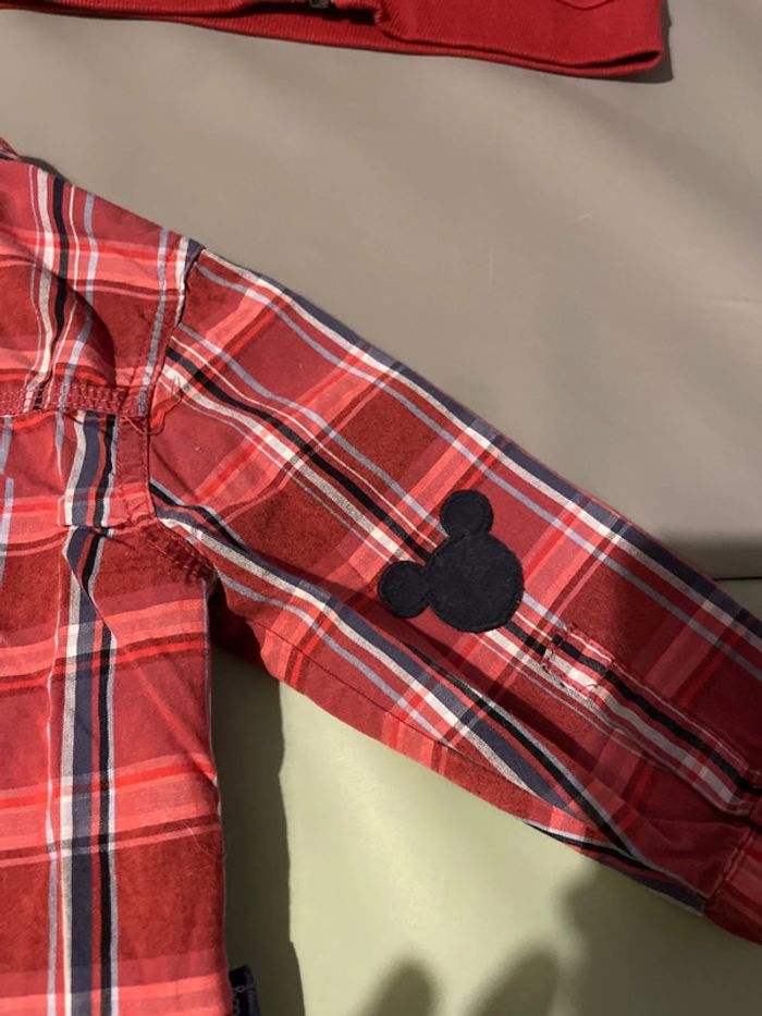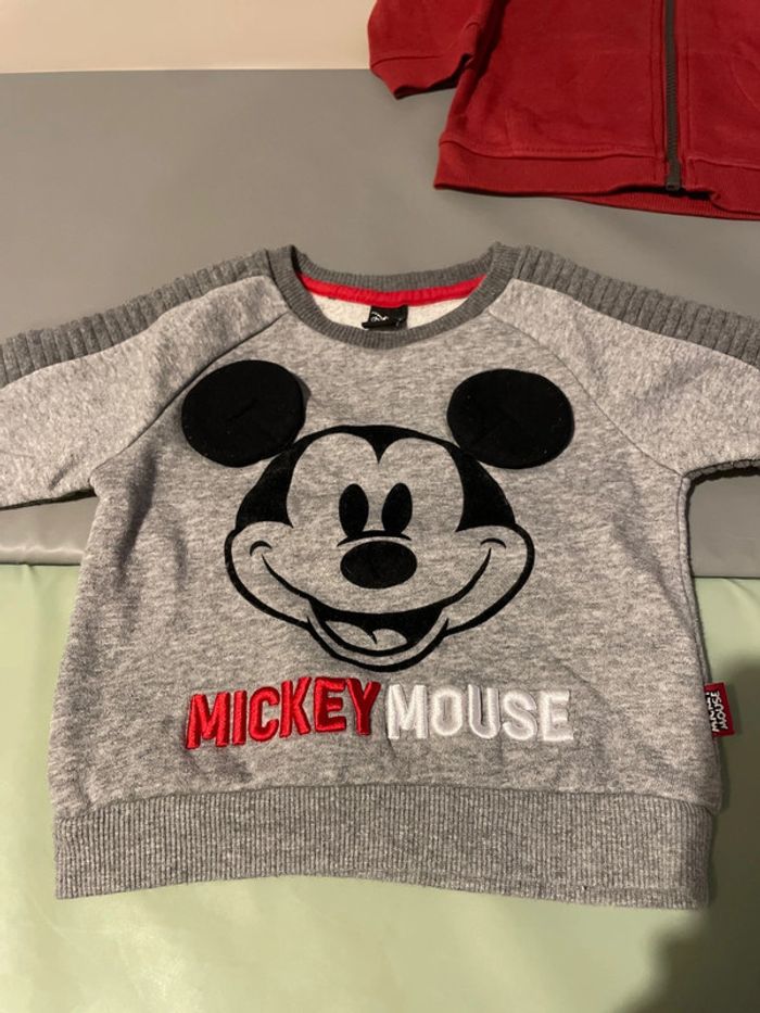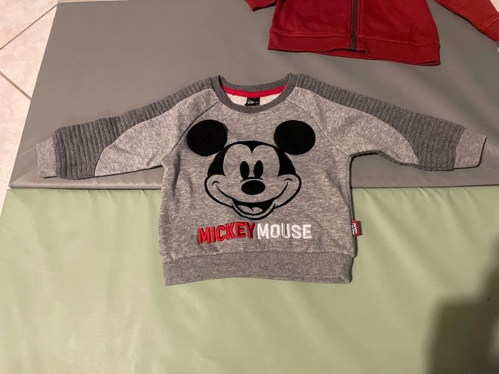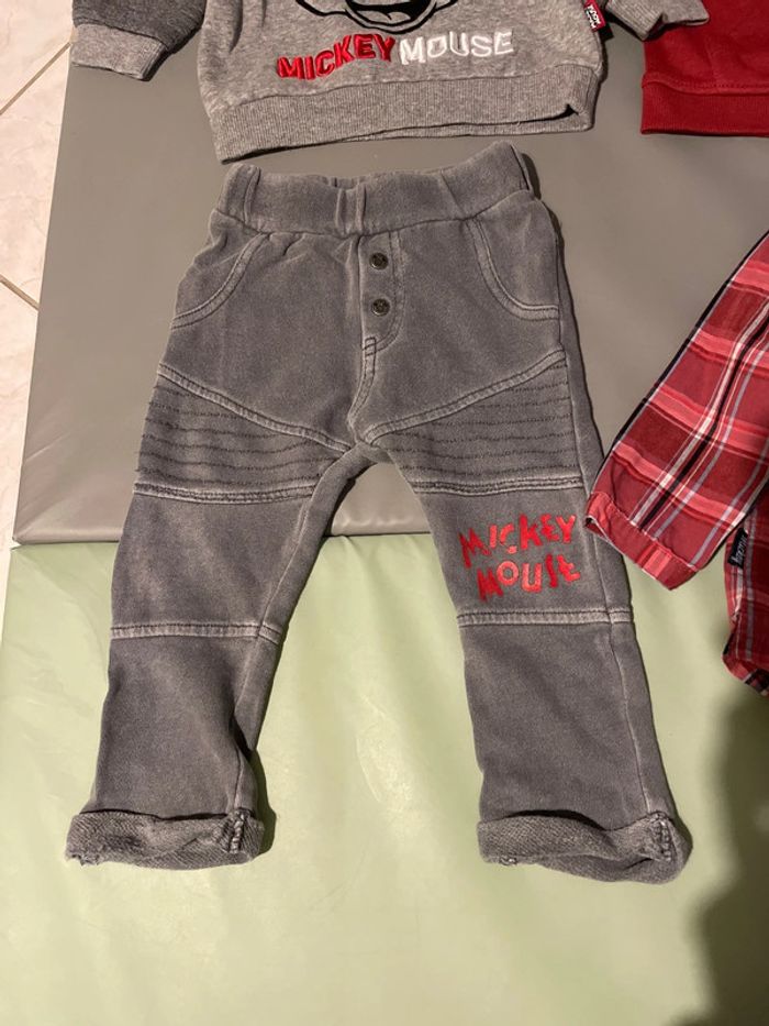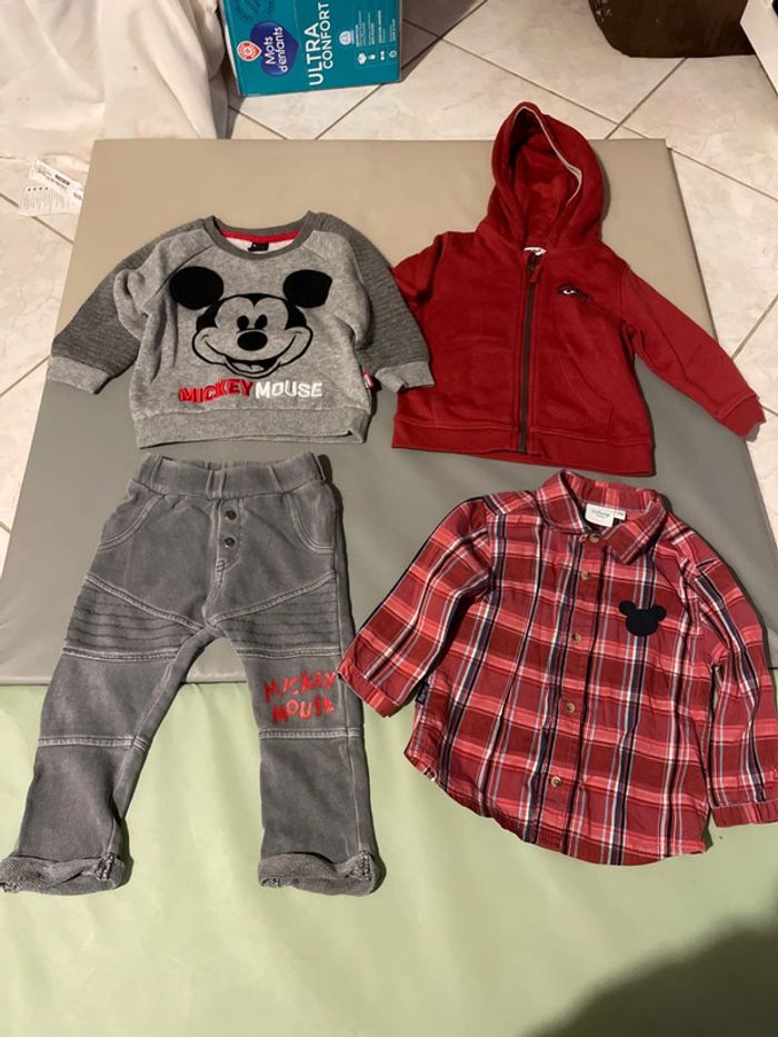 Ensemble 12 mois Mickey composé d’un pantalon de jogging Mickey imitation jean, d’un sweat Mickey avec oreilles en relief, d’une veste zippée à capuche « Super Héros) et d’une chemise à carreaux avec motif Mickey au niveau du cœur et des coudes. Ensemble confortable et très joli rendu porté.