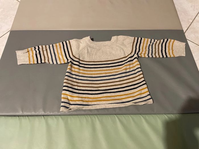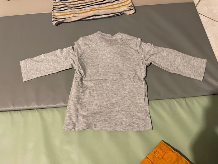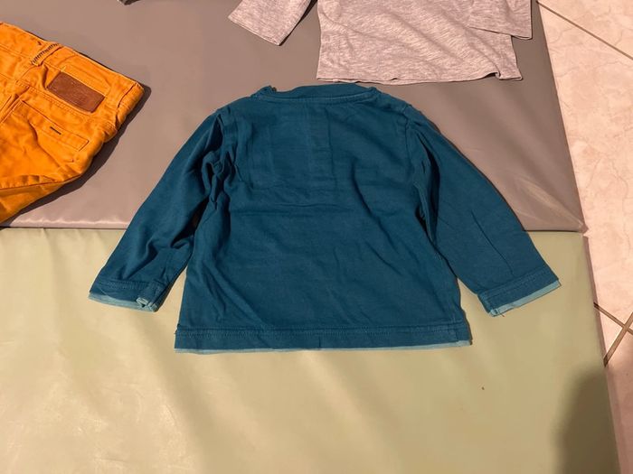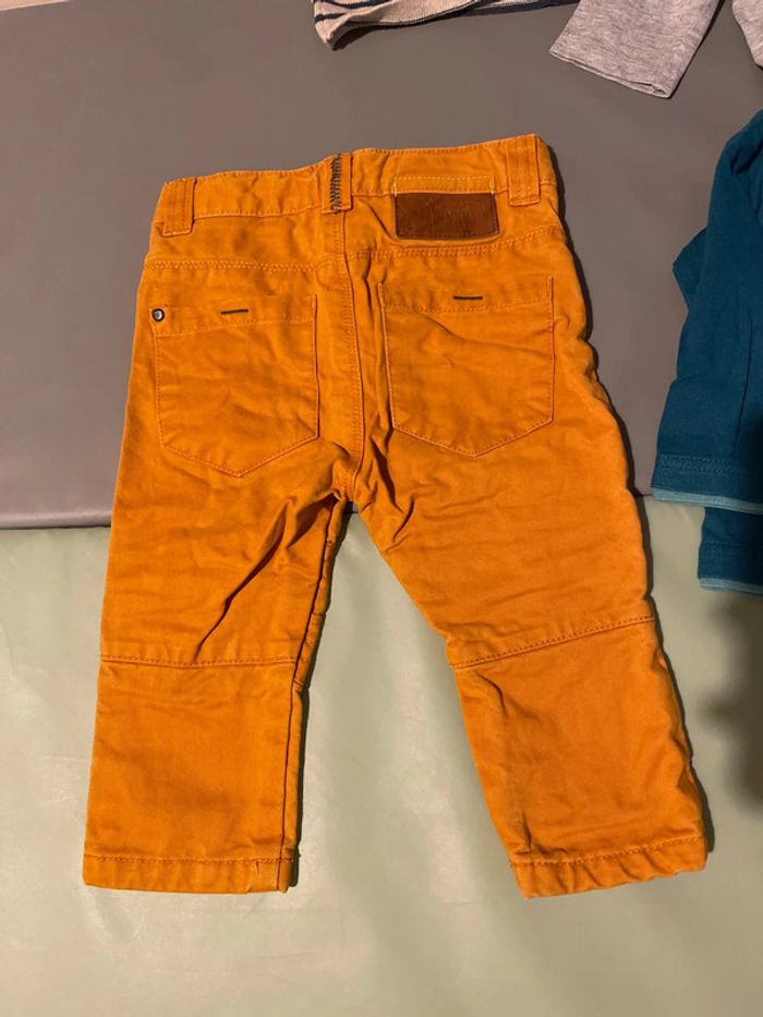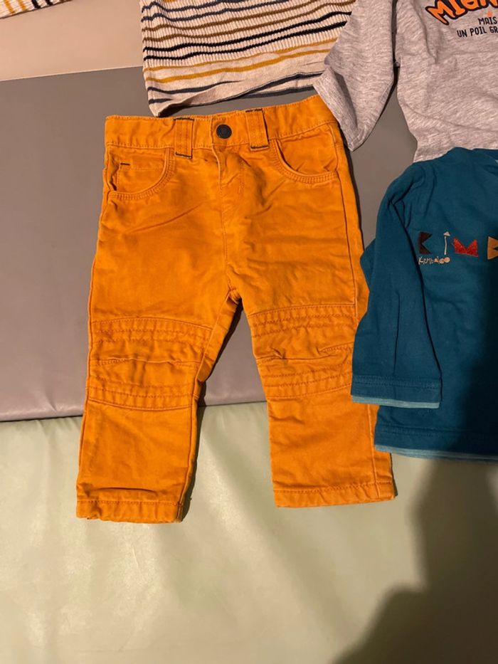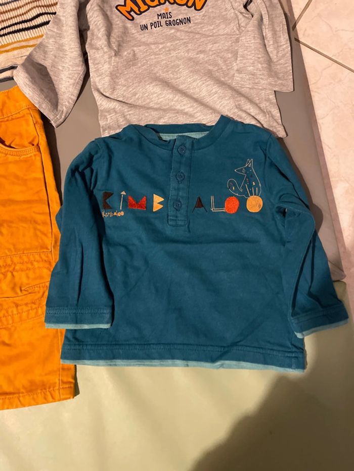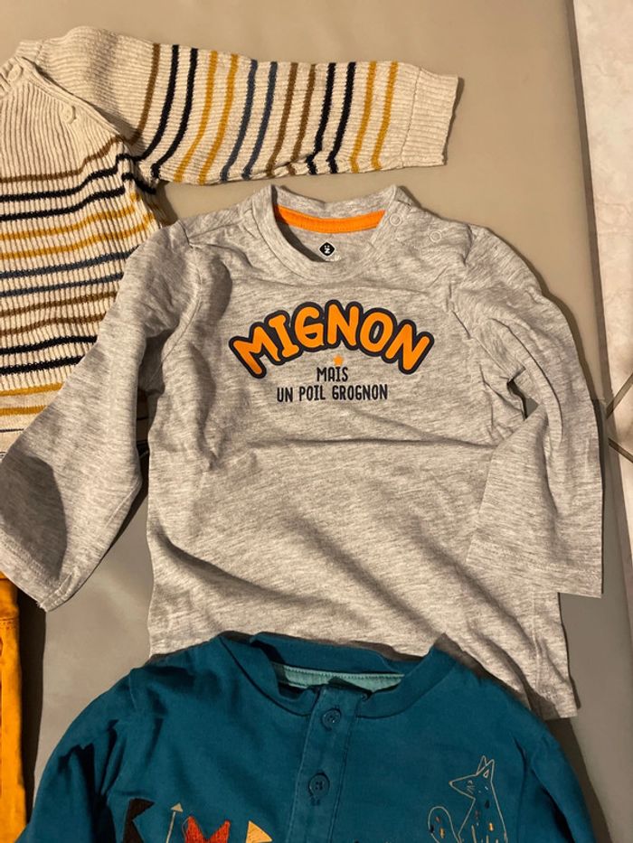 Ensemble 12 mois composé d’un pantalon de la marque Du pareil au même qui se ressert à la taille, d’un pull en laine (taille 4-6 mois 68 cm mais taille très grand) de marque Name It (provient de la malle Little cigogne) et de deux hauts à manches longues (un bleu de marque Kimbaloo et un gris avec inscription « Mignon mais un poil grognon » de marque Grain de Blé). Excellent état #dressingdeMilo12moisgarçon