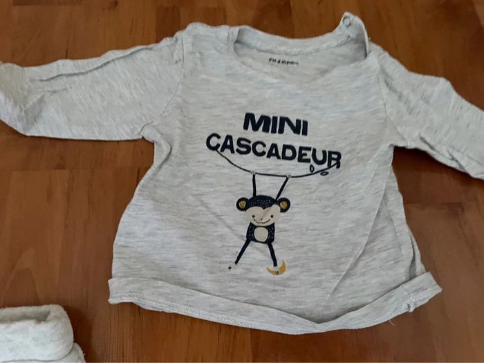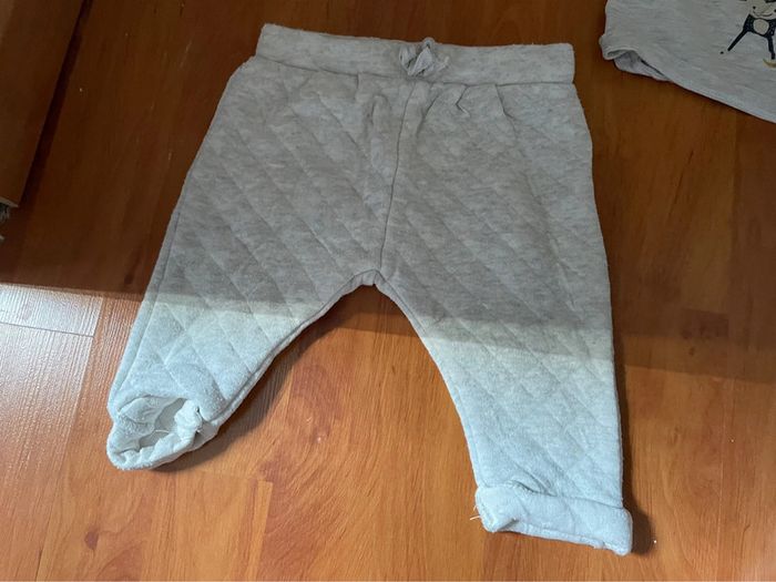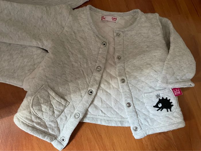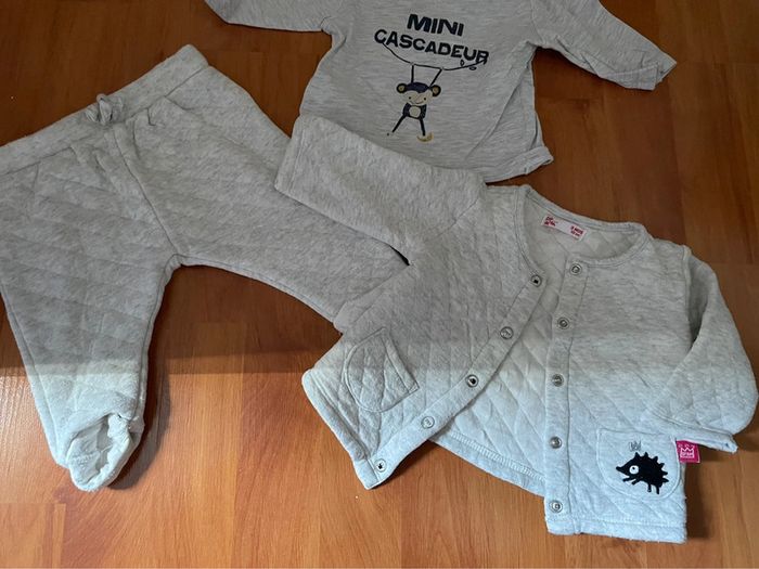 Ensemble 3 mois compde d’un pantalon style jogging et d’une veste à pressions de marque Du pareil au même et d’un haut à manches longues de marque Kiabi. Très bon état #dressingdeMilo3moisgarçon