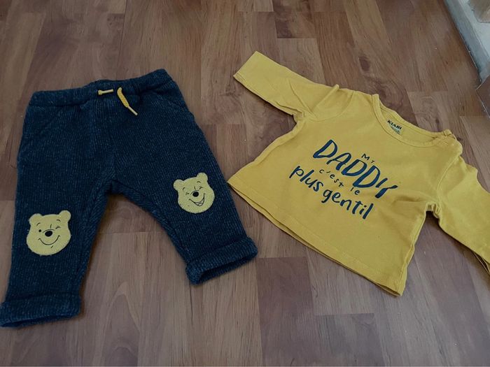 Ensemble 3 mois Winnie l’ourson composé d’un pantalon en tissu confortable Winnie l’ourson et d’un haut à manches longues avec inscription « My Daddy c’est le plus gentil » en très bon état. #dressingdeMilo3moisgarçon