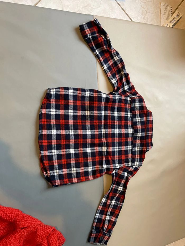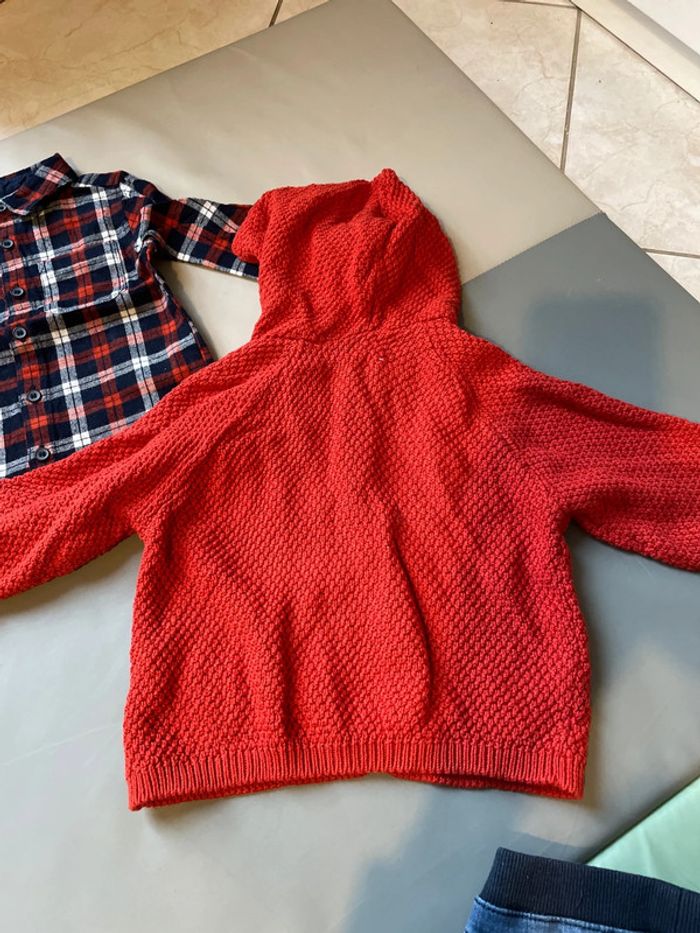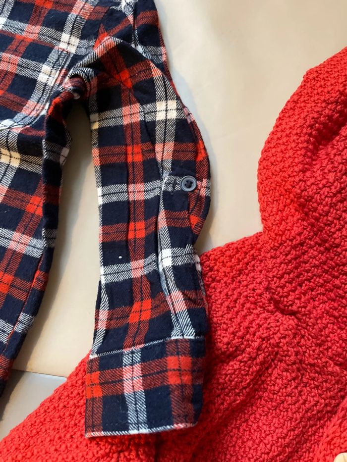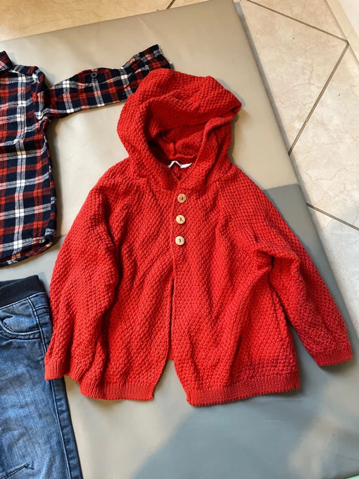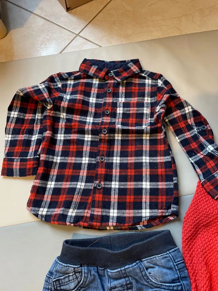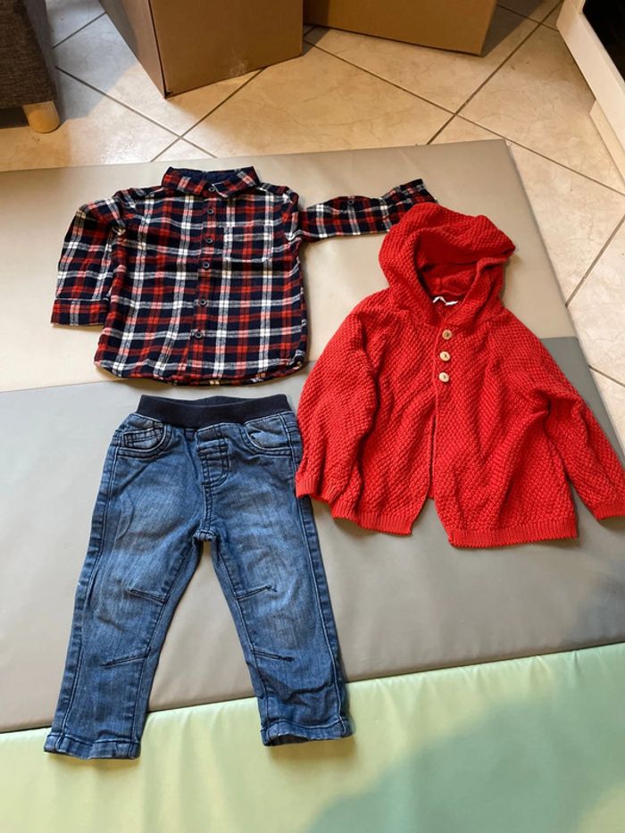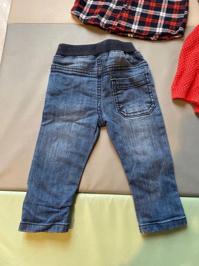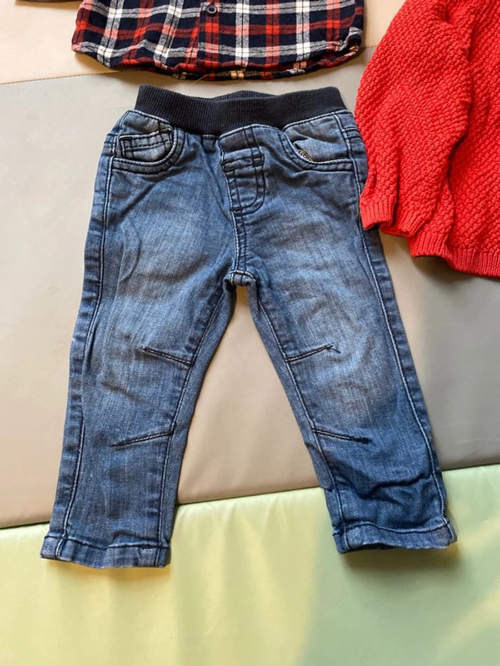 Ensemble 3 pièces 12 mois composé un jean élastique indiqué 9 mois 74 cm, d’une chemise à carreaux épaisse 9-12 mois et d’un gilet en laine à capuche de marque Eden et Victor taille 12 mois. Excellent état #dressingdeMilo9moisgarçon #dressingdeMilo12moisgarçon