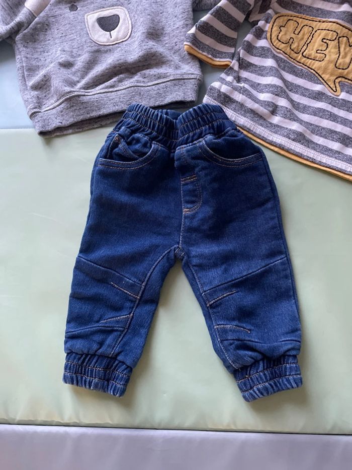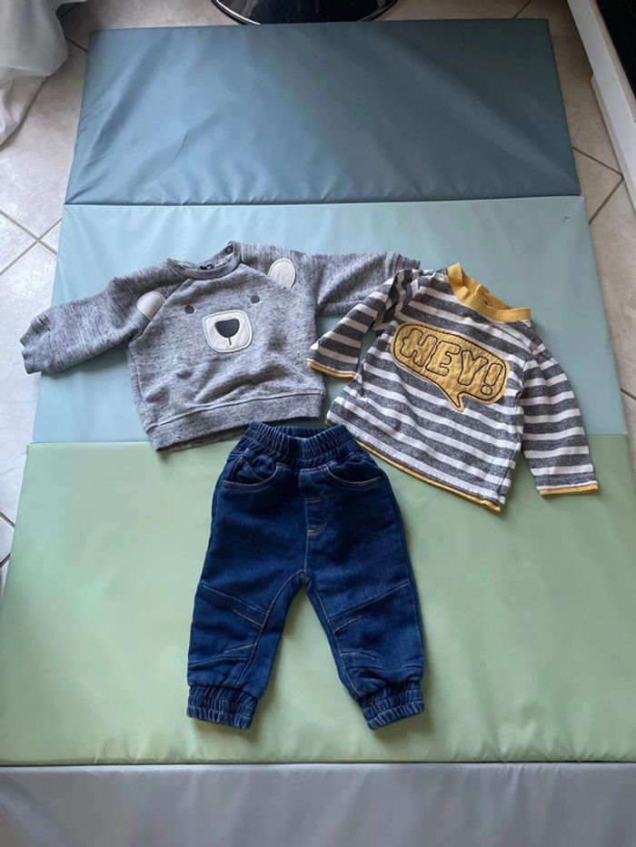 Ensemble 6 mois compose d’un jean elastique, d’un sweat ourson et d’un haut à manches longues. Très bon état. #dressingdeMilo6moisgarçon
