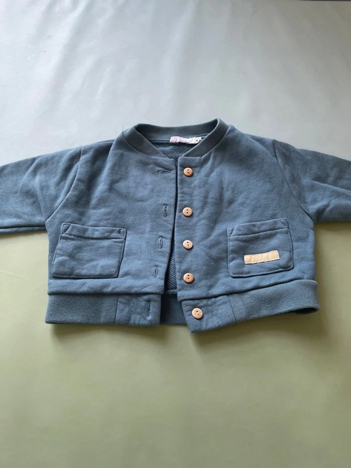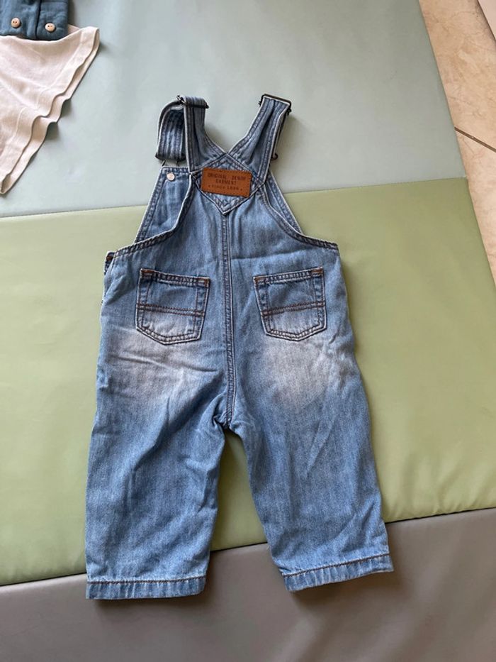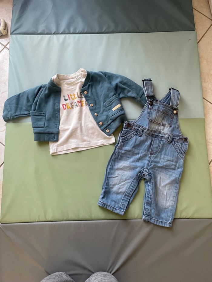 Ensemble 6 mois composé d’une salopette en jean (avec ouverture entre les jambes très pratiques pour les changes), d’un haut à manches longues de marque Name it et d’une veste à boutons de marque Eden et Victor. Très bon état #dressingdeMilo6moisgarçon