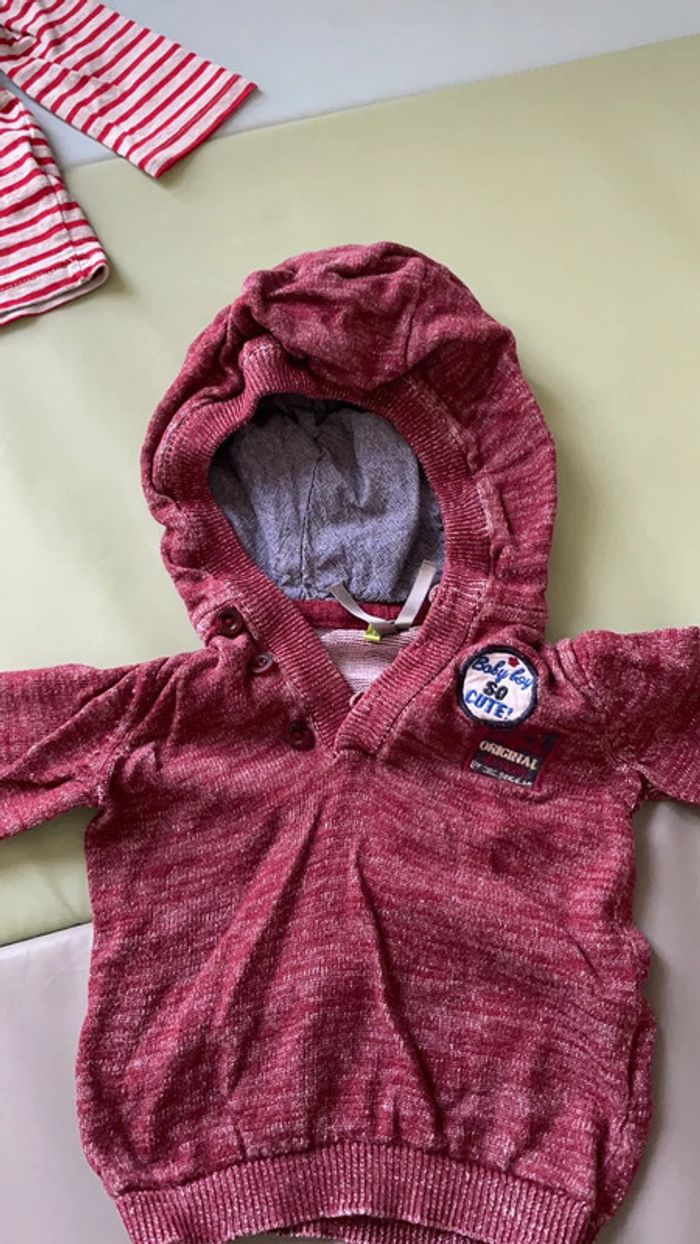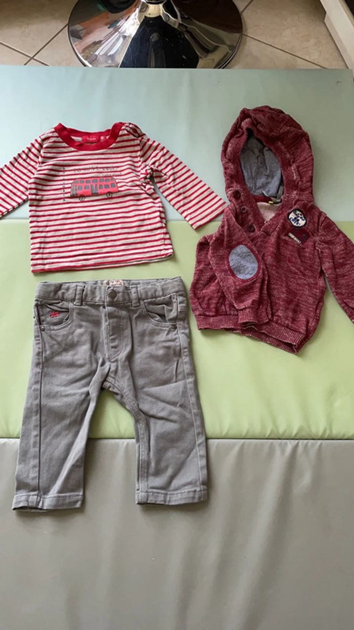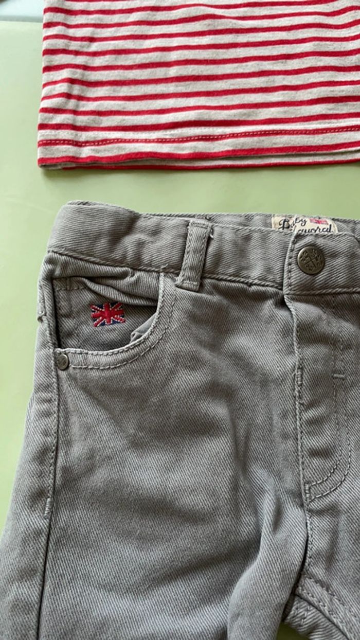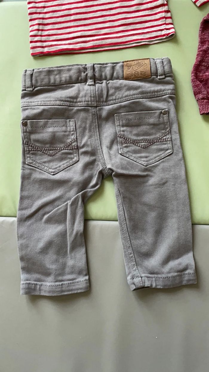 Ensemble 6 mois composé d’un jean gris, d’un haut à manches longues rayé et d’un pull fin en laine avec capuche. Très bon état #dressingdeMilo6moisgarçon