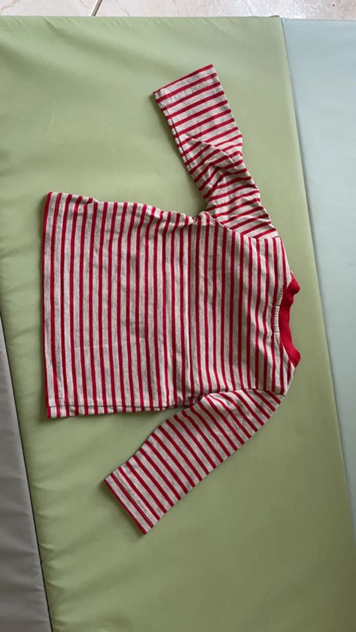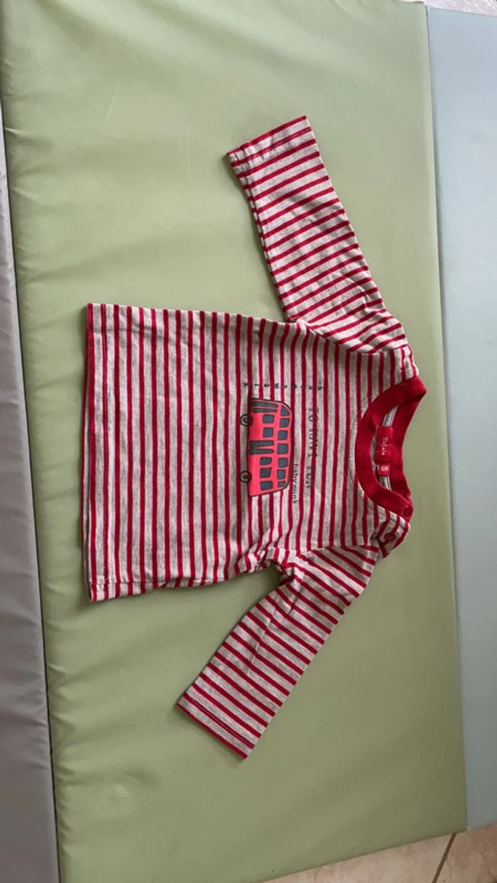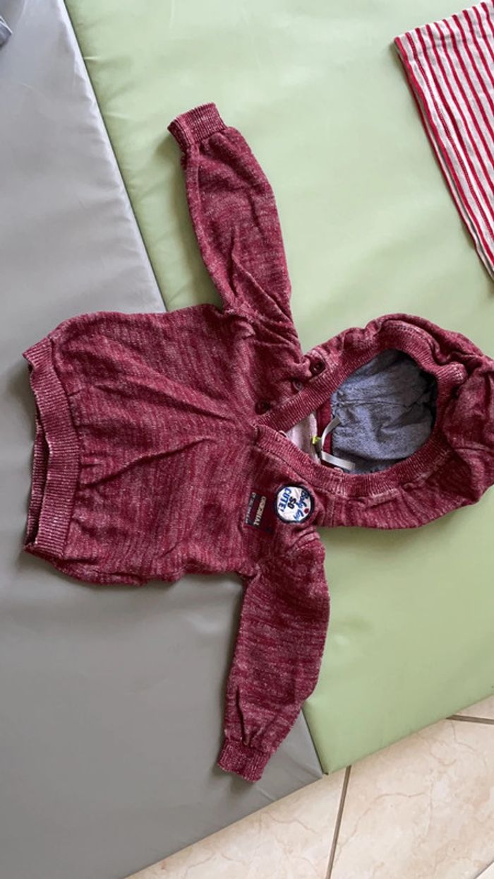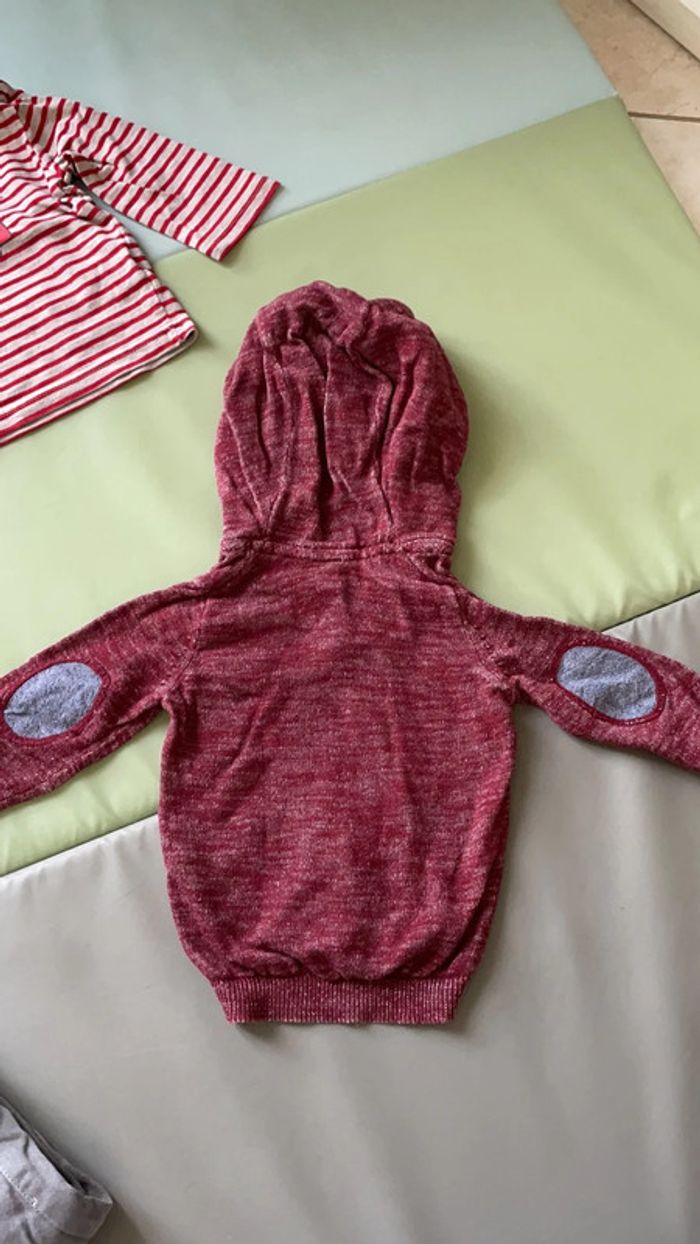 Ensemble 6 mois composé d’un jean gris, d’un haut à manches longues rayé et d’un pull fin en laine avec capuche. Très bon état #dressingdeMilo6moisgarçon