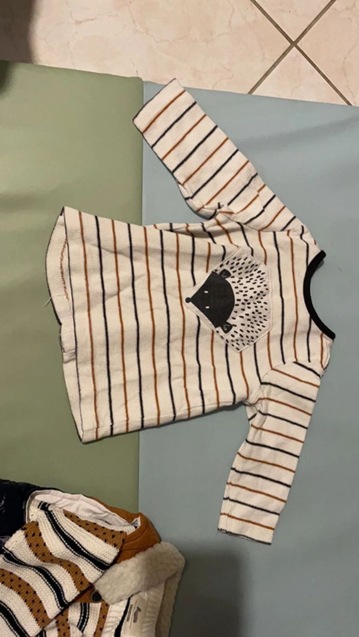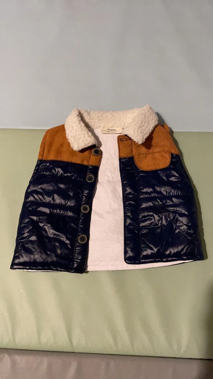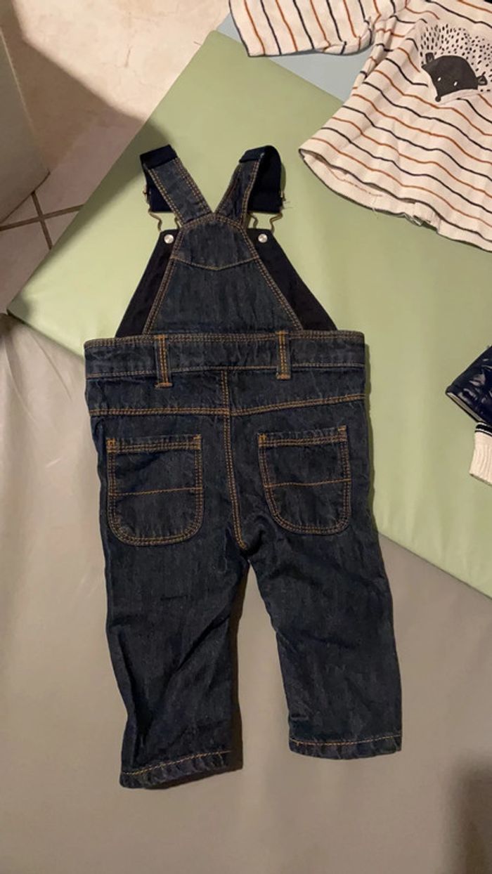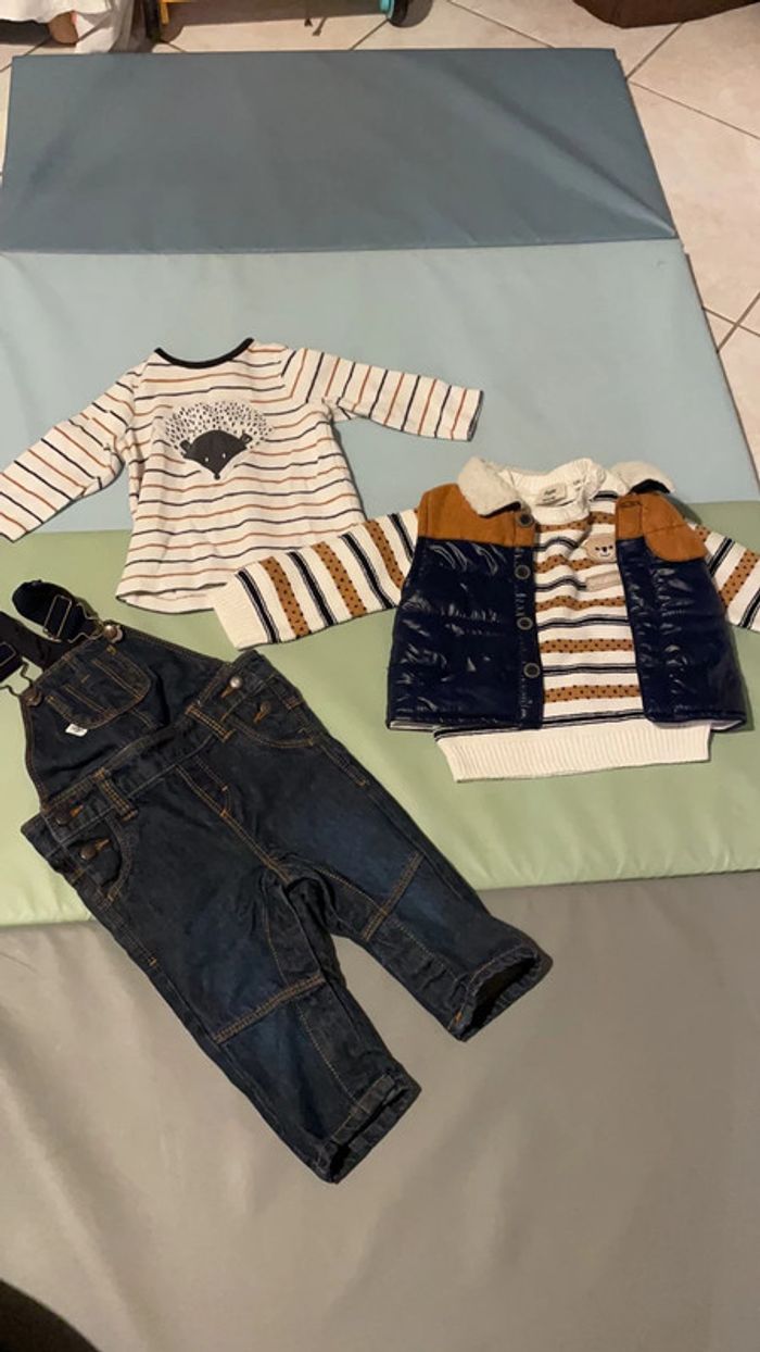 Lot 6 mois hiver composé d’une salopette en jean, d’un haut à manches longues, d’un pull en laine et d’une doudoune sans manche en imitation daim. Très bon état #dressingdeMilo6moisgarçon