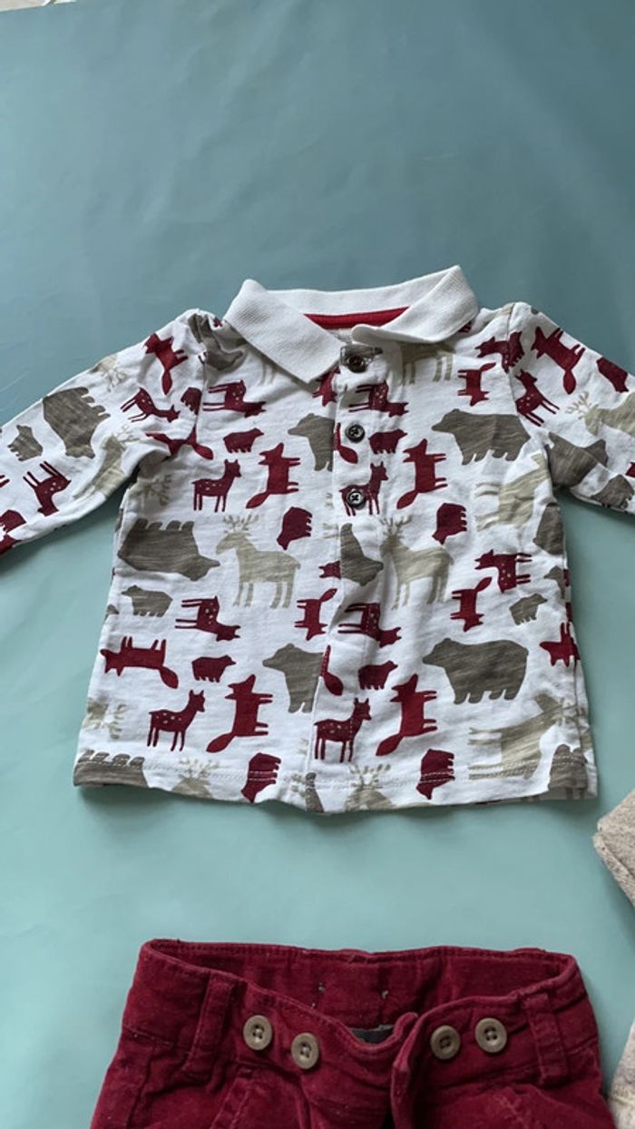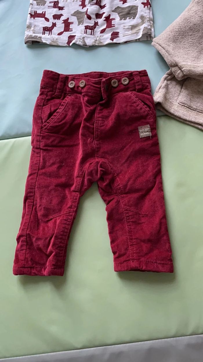 Ensemble 6 mois hiver composé d’un pantalon bordeaux en velours, d’un haut à manches longues style polo avec ouverture à l’avant sur toute la longueur et d’une veste à capuche zippée. Pantalon vendu avec bretelles non présentes sur la première photo mais présente sur la dernière. Très bon état. #dressingdeMilo6moisgarçon