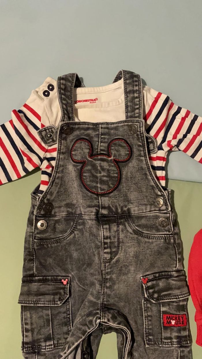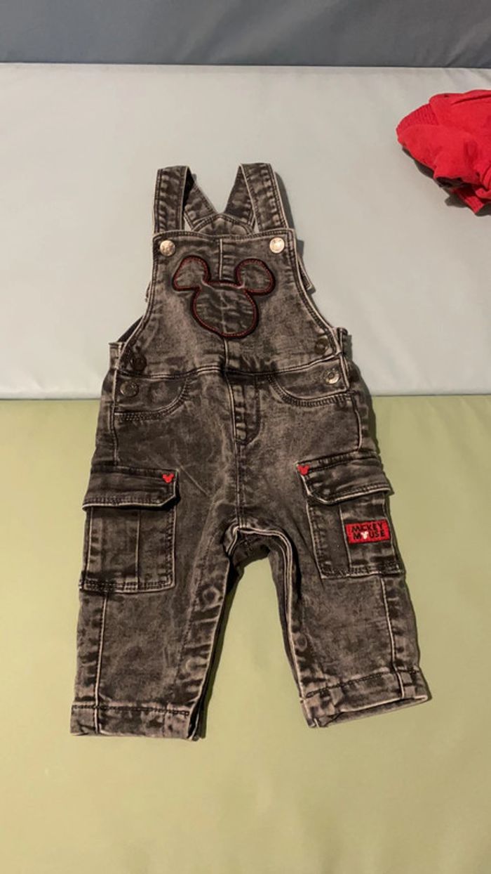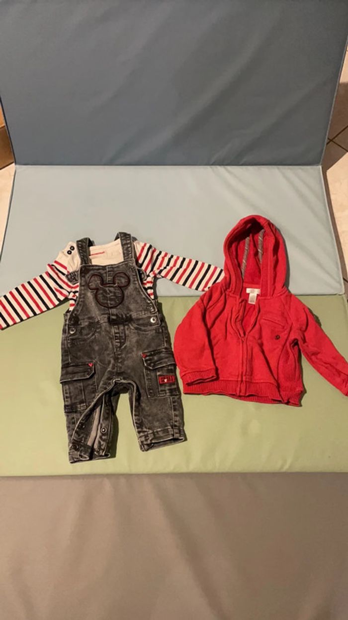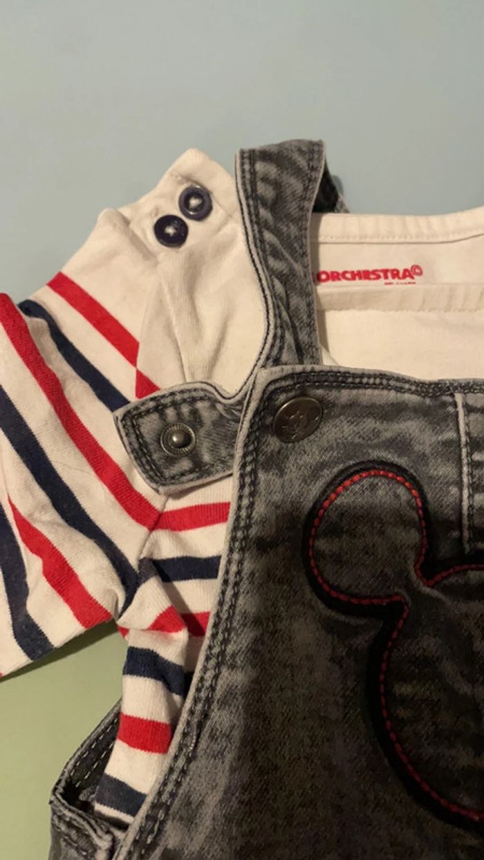 Ensemble 6 mois composé d’une salopette en jean Mickey, d’un haut à manches longues rayé et d’une veste zippée rouge. Le tout est en excellent état (très peu porté) #dressingdeMilo6moisgarçon