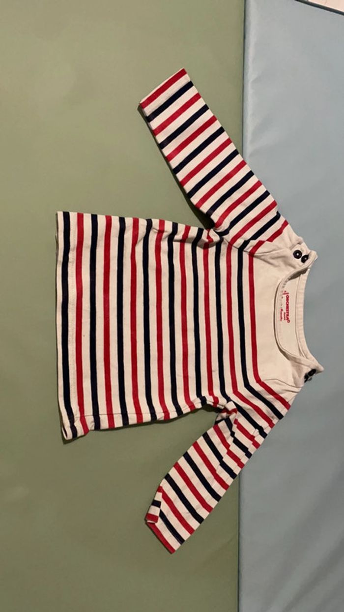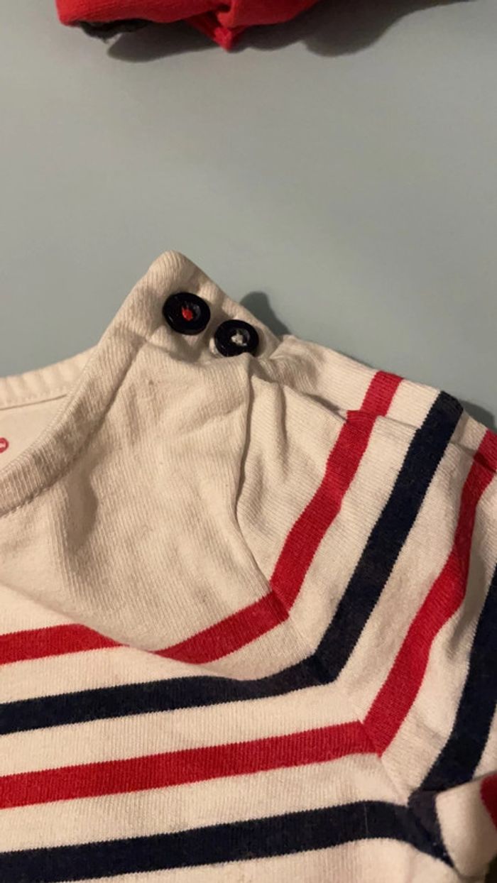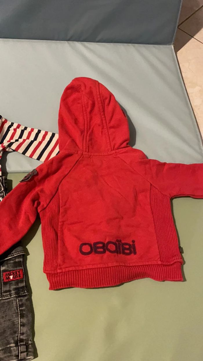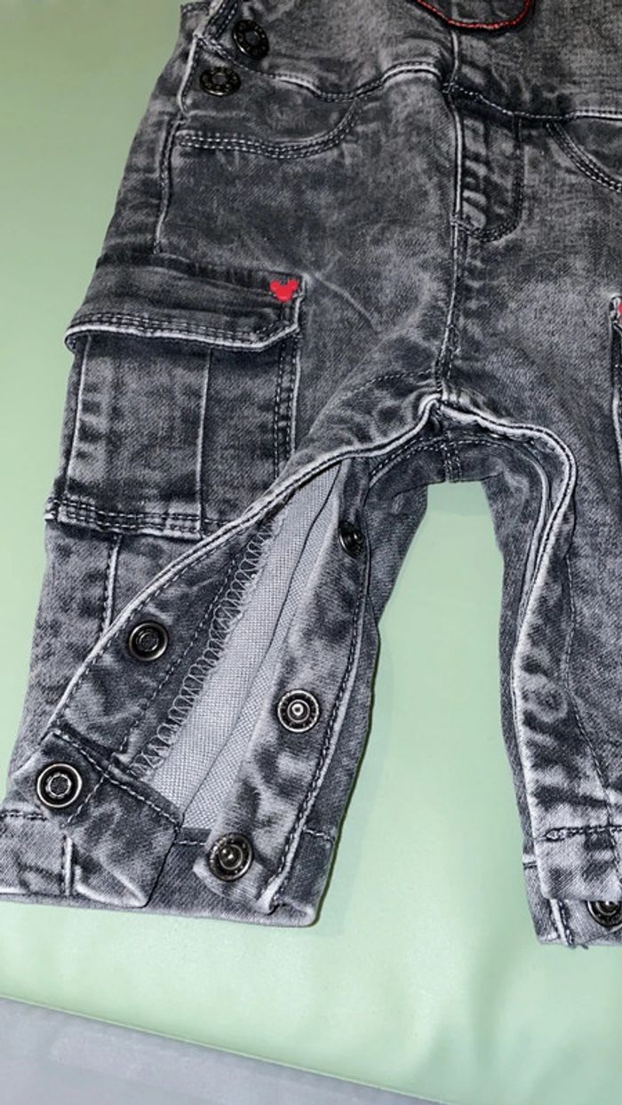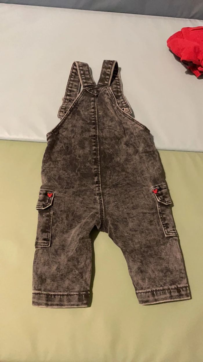 Ensemble 6 mois composé d’une salopette en jean Mickey, d’un haut à manches longues rayé et d’une veste zippée rouge. Le tout est en excellent état (très peu porté) #dressingdeMilo6moisgarçon
