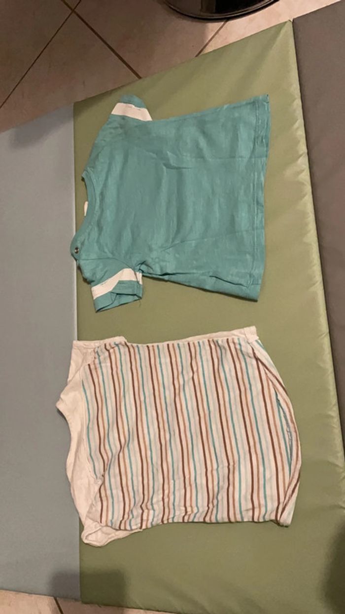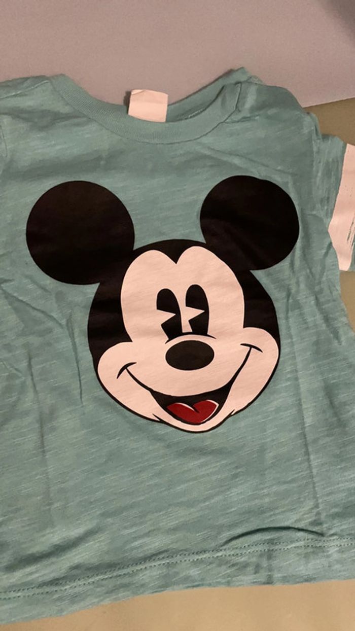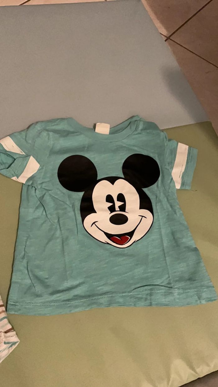 Lot de 2 t-shirt à manches courtes 6 mois : un turquoise Mickey et un blanc à rayures marron et bleu marque Orchestra. Excellent état #dressingdeMilo6moisétégarçon