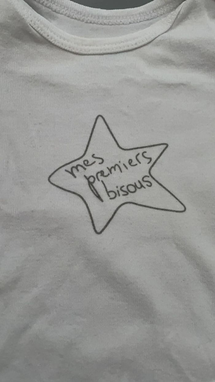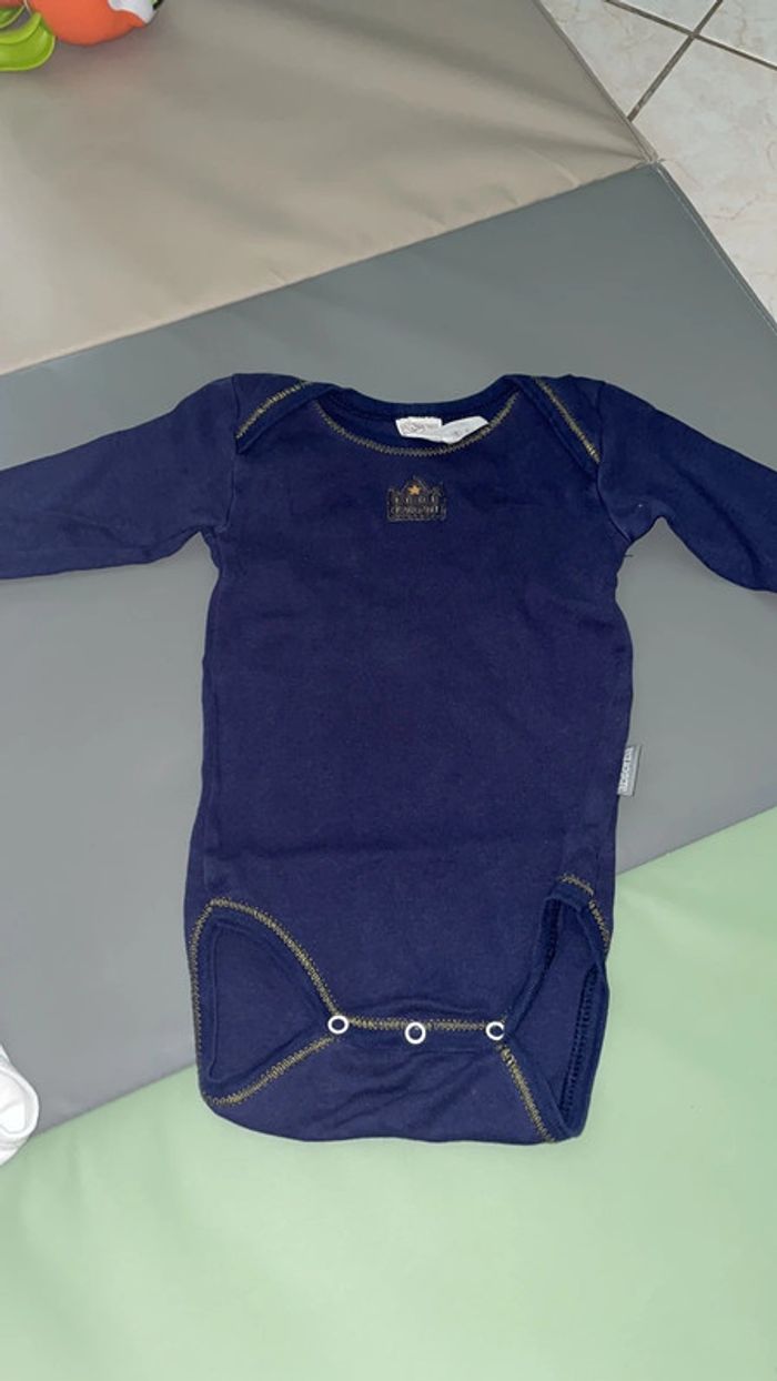 Lot de 3 bodies manches longues 6 mois : un bleu marine marine Absorba en excellent état, un blanc avec inscription « mes premiers bisous » en très bon état marque Vertbaudet et un blanc motif ourson dont la couleur est un peu moins éclatante qu’au début mais reste en bon état. #dressingdeMilo6moisgarçon