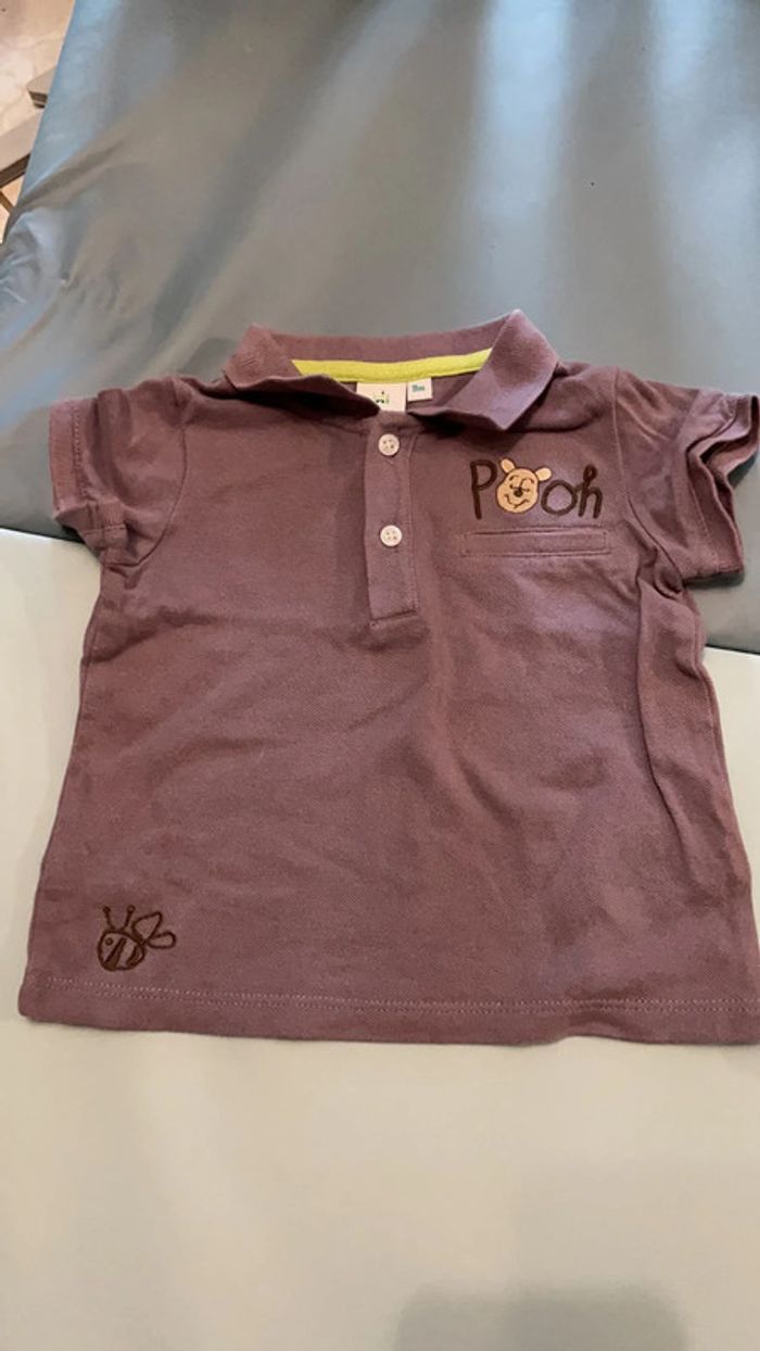 Lot de 2 polos manches courtes 9 mois : un violet Winnie l’ourson, 1 bleu marine et vert fluo. Très bon état #dressingdeMilo9moisétégarçon