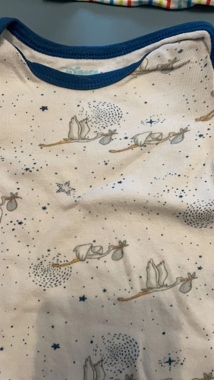 Lot de 2 bodies manches longues 6 mois : un rayé et coloré de marque Orchestra avec motif voiture qui se ferme en cache coeur et un Disney blanc avec motif cigogne (Dumbo) qui se passe par la tête. Excellent état. #dressingdeMilo6moisgarçon