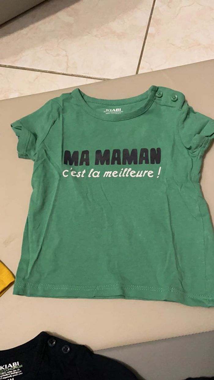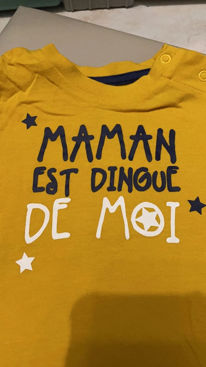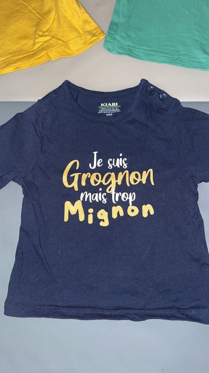 Lot de 3 t-shirt 6 mois dont 2 à petites manches spécial maman (1 moutarde marque Grain de blé avec inscription « Maman est dingue de moi » et un vert avec inscription « Ma maman c’est la meilleure ! ») et un à grandes manches avec inscription « Je suis Grognon mais trop mignon ». Pensez à la fête des mères 😉 Très bon état, pas de trous, ni de tâches. #dressingdeMilo9moisgarçon #dressingdeMilo9moisétégarçon
