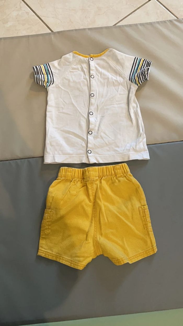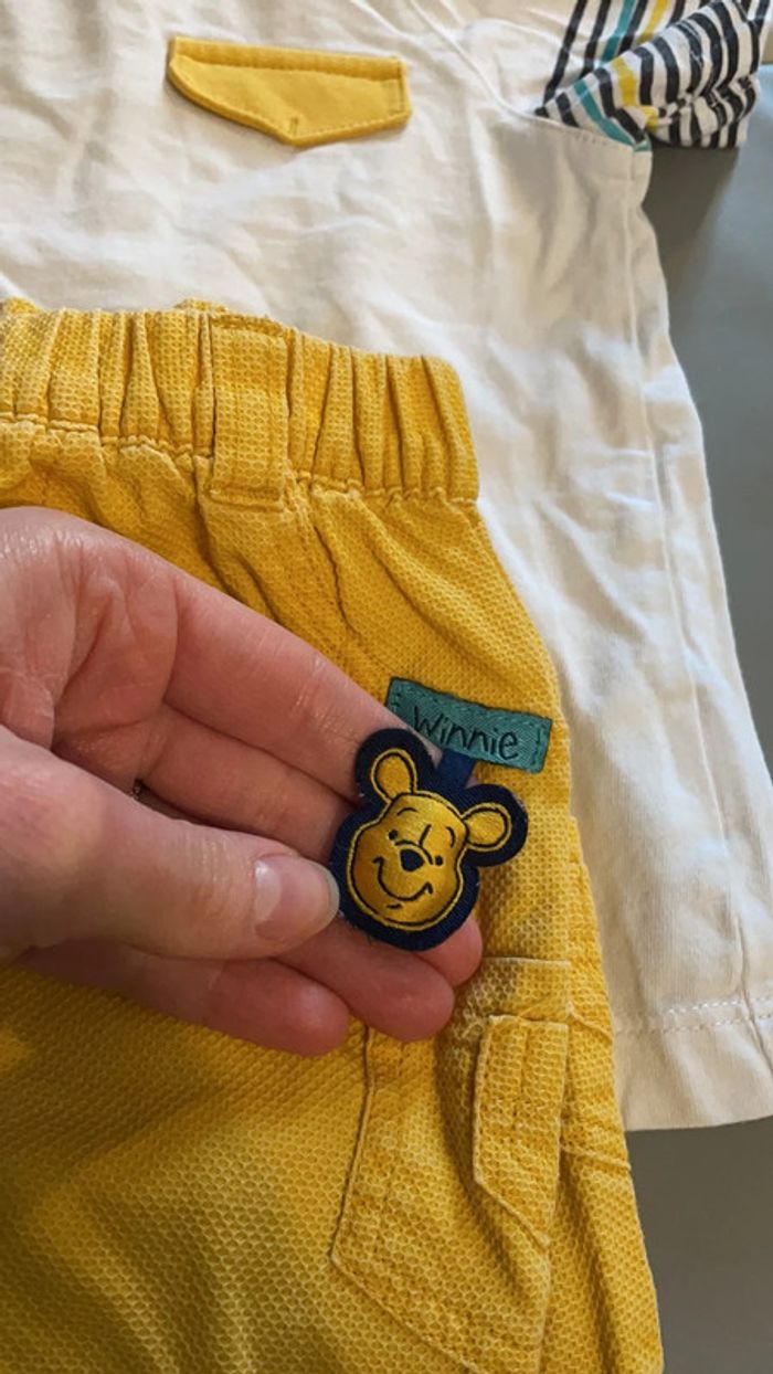 Ensemble été 9 mois Winnie l’ourson composé d’un short et d’un t-shirt qui se ferme à l’arrière par des pressions. Excellent état #dressingdeMilo9moisétégarçon