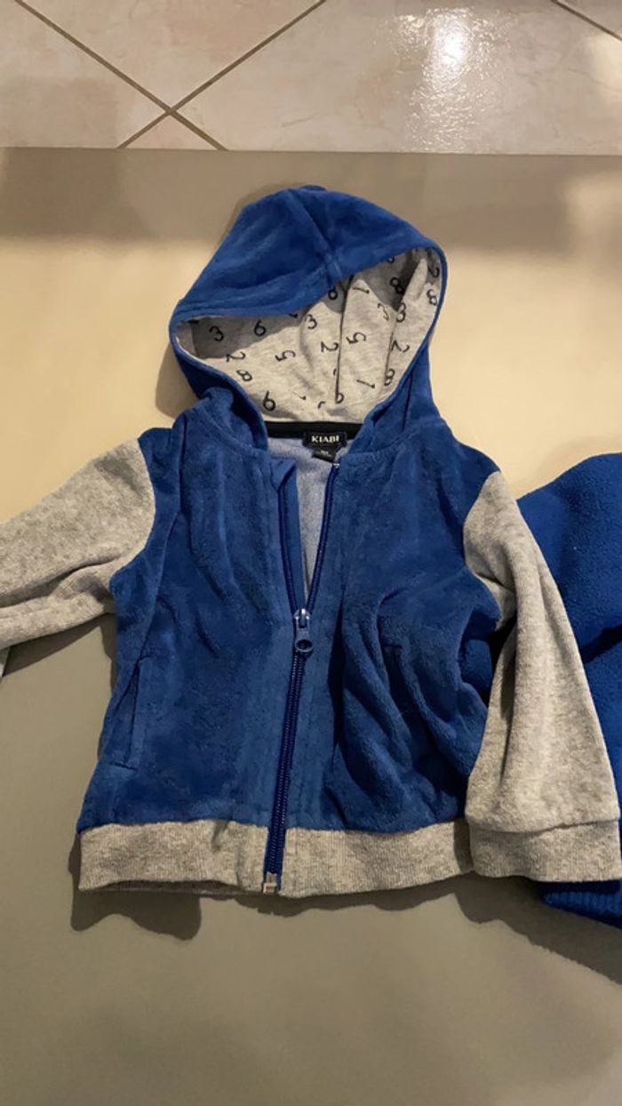 Lot de 2 vestes chaudes à capuche 9 mois. Une bleue et grise en velours et une bleue et grise avec intérieur fourré. Très bon état #dressingdeMilo9moisgarçon