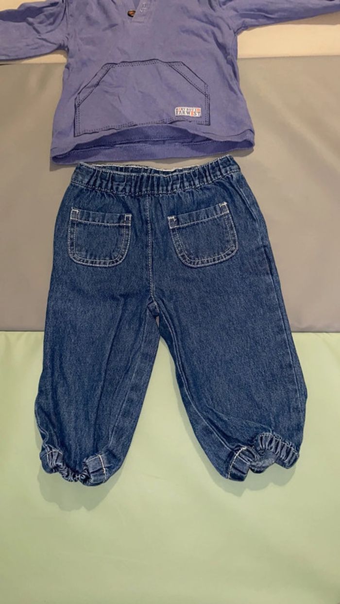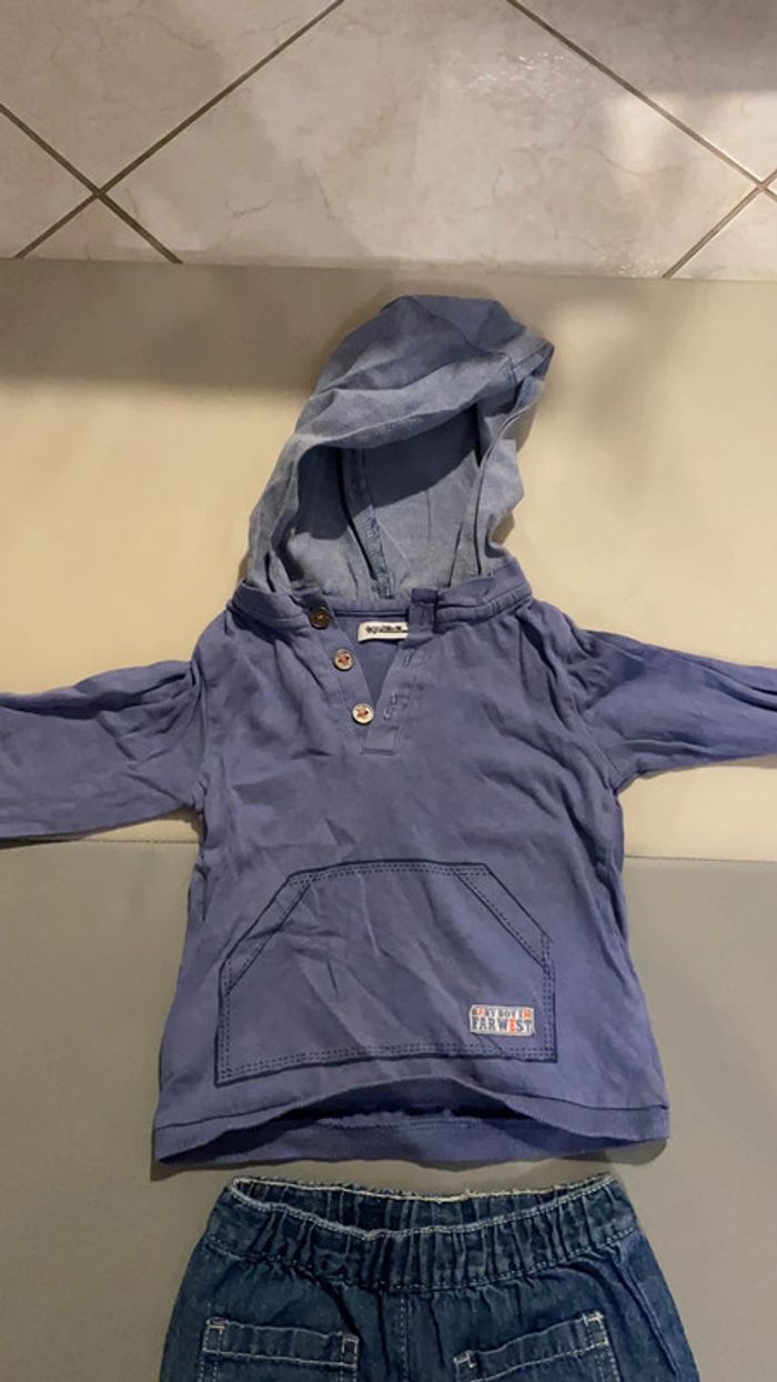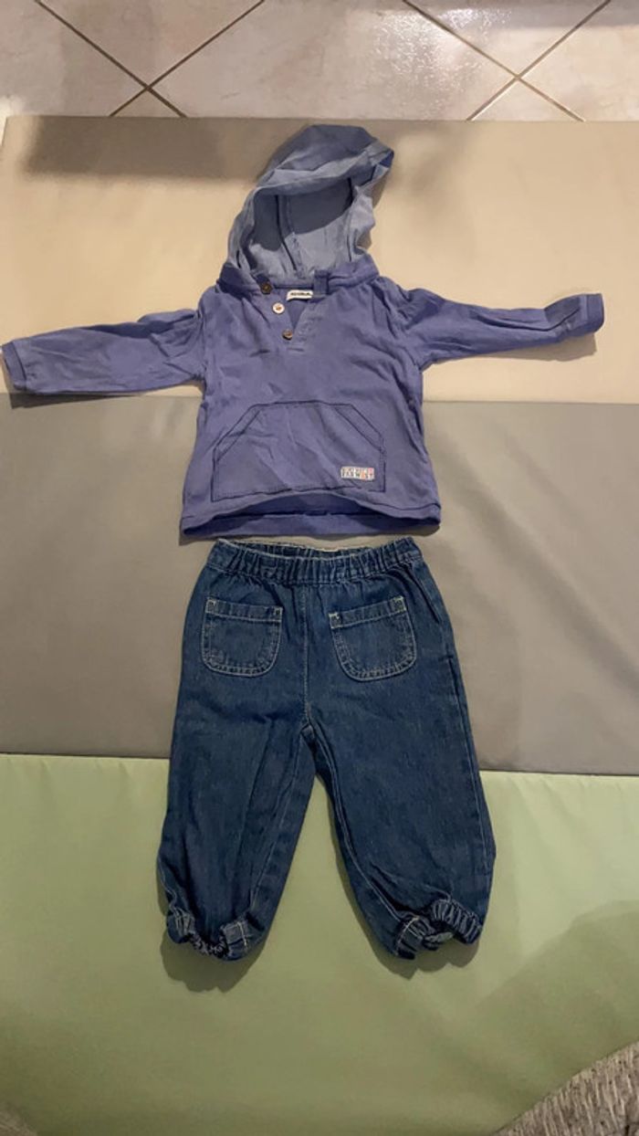Ensemble 9 mois composé d’un jean élastique et haut à manches longues et capuche. Très bon état #dressingdeMilo9moisgarçon