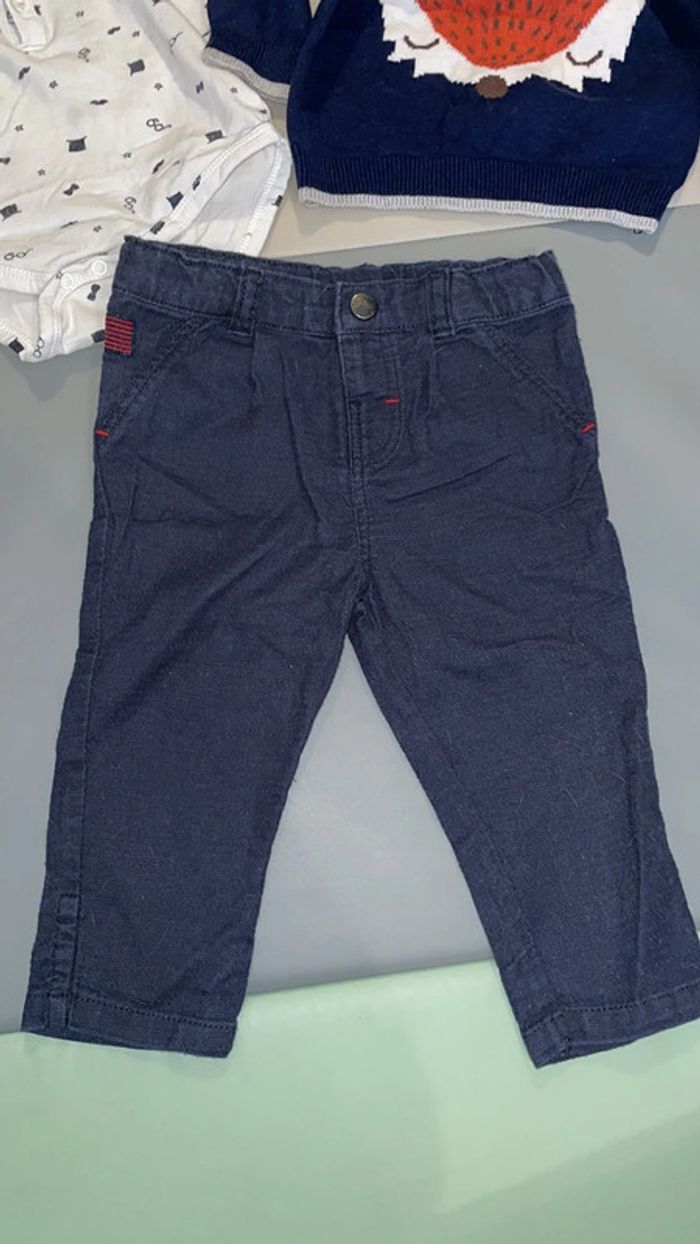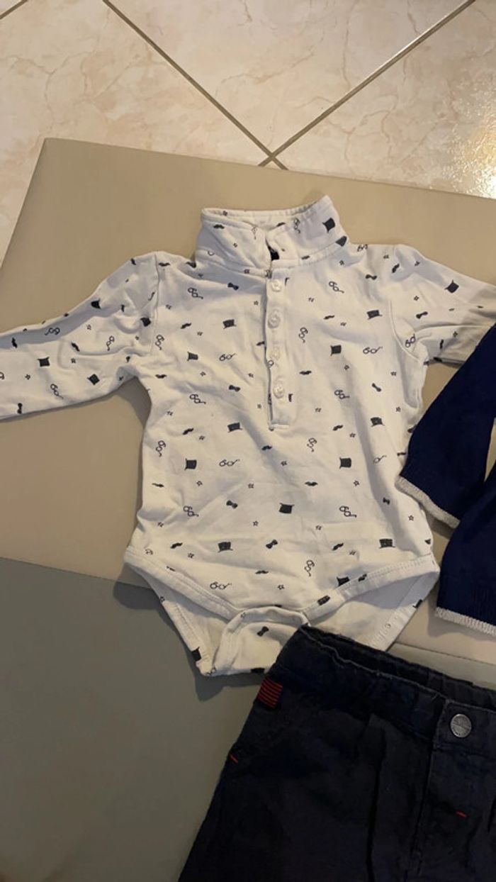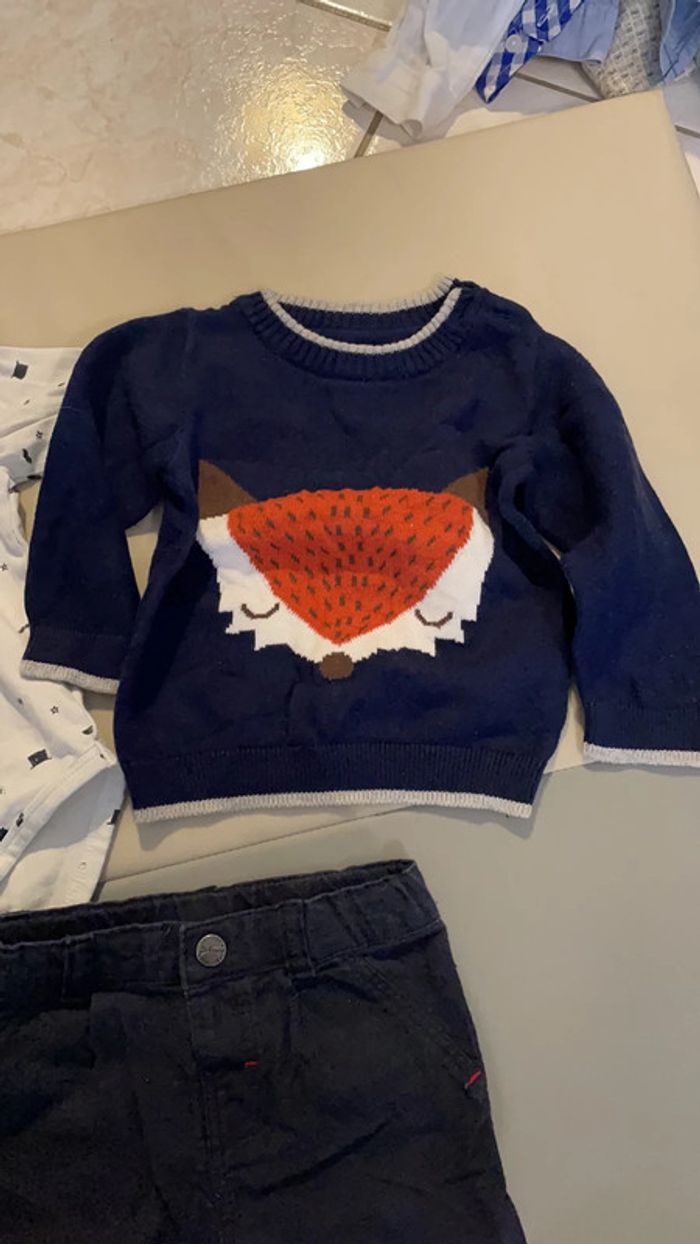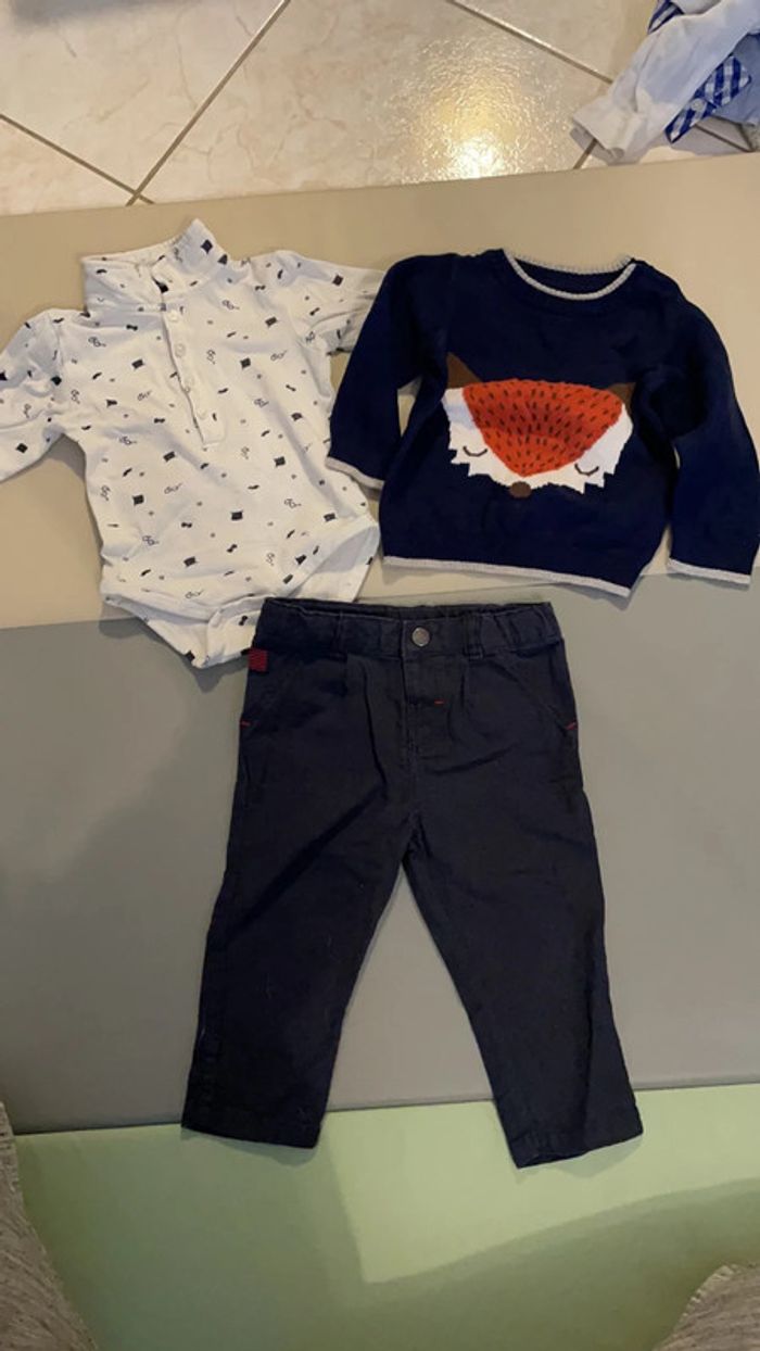 Ensemble 9 mois composé d’un pantalon, d’un pull en laine et d’un body à col (un bouton du col est cassé à niveau du plastique, sûrement dû à un choc dans la machine à laver mais il fonctionne malgré cela). Le reste est en excellent état (pull porté 1 fois) #dressingdeMilo9moisgarçon