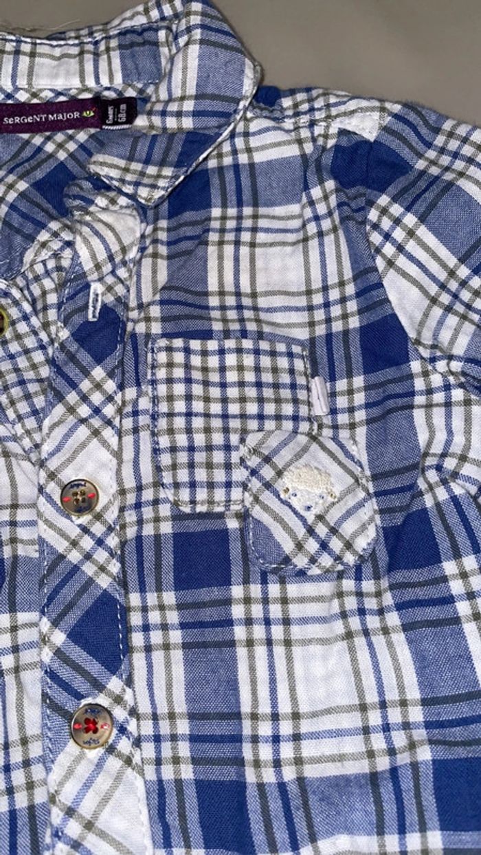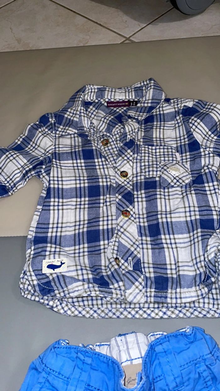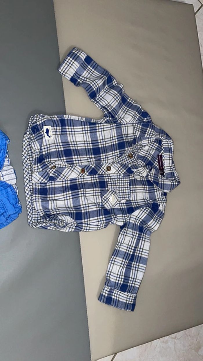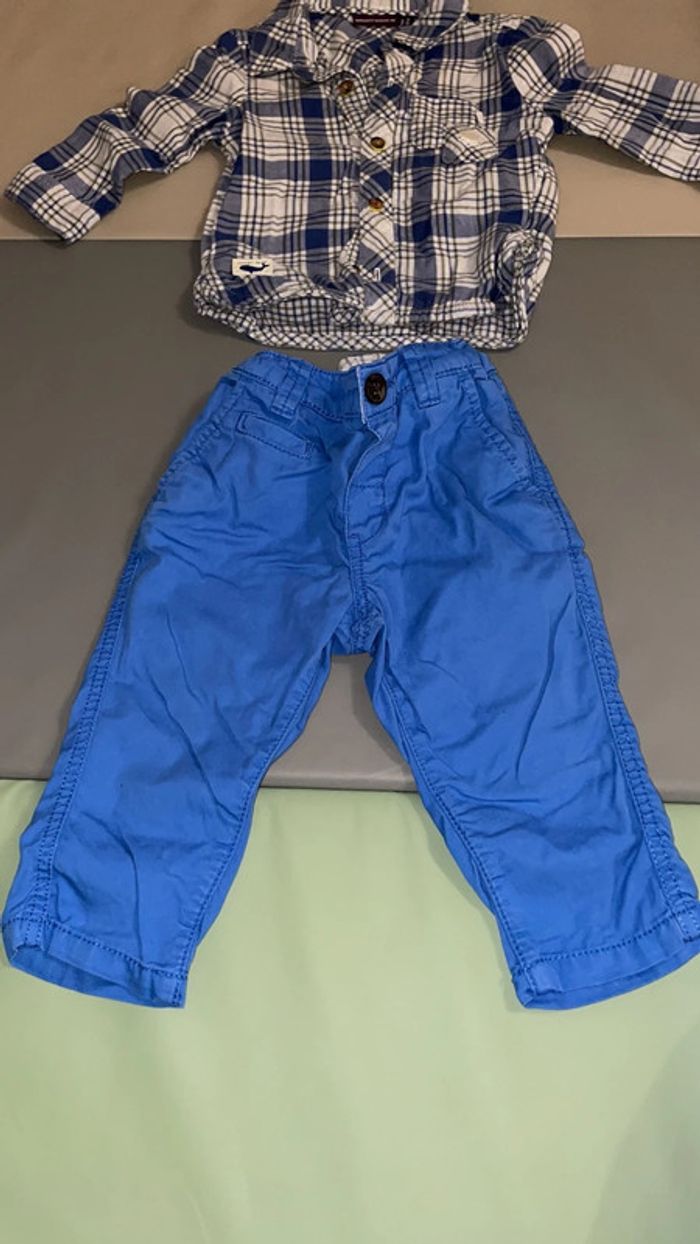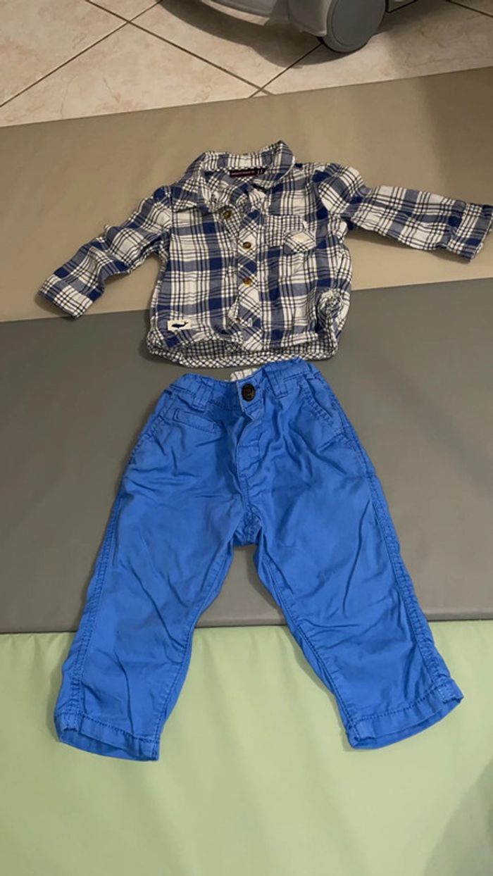 Ensemble 6 mois composé d’une chemise à carreaux bleue, blanche et kaki et d’un pantalon bleu. Excellent état #dressingdeMilo6moisgarçon