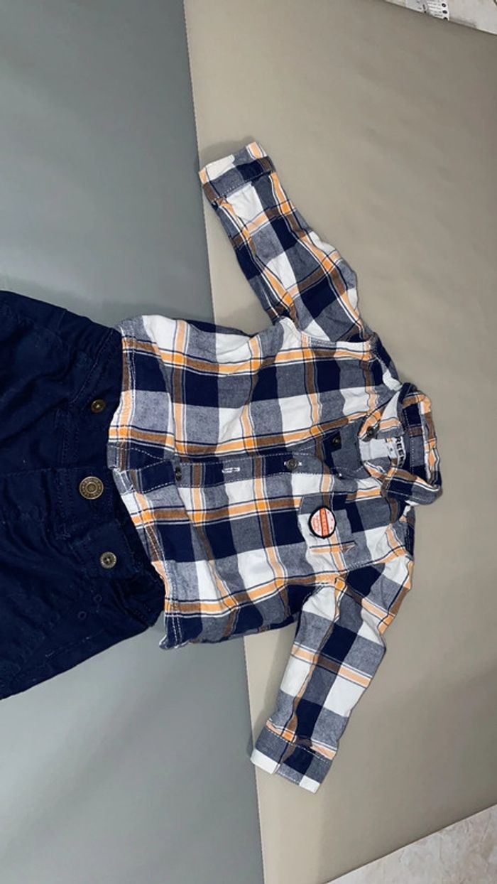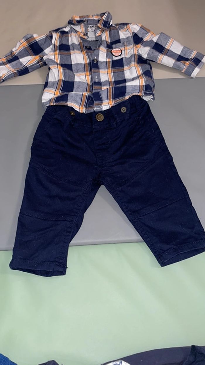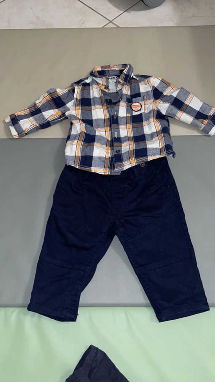 Lot 6 mois composé d’un pantalon bleu marine qui se ressert à la taille et d’une chemise à carreaux marine, blanche et orange. Excellent état #dressingdeMilo6moisgarçon